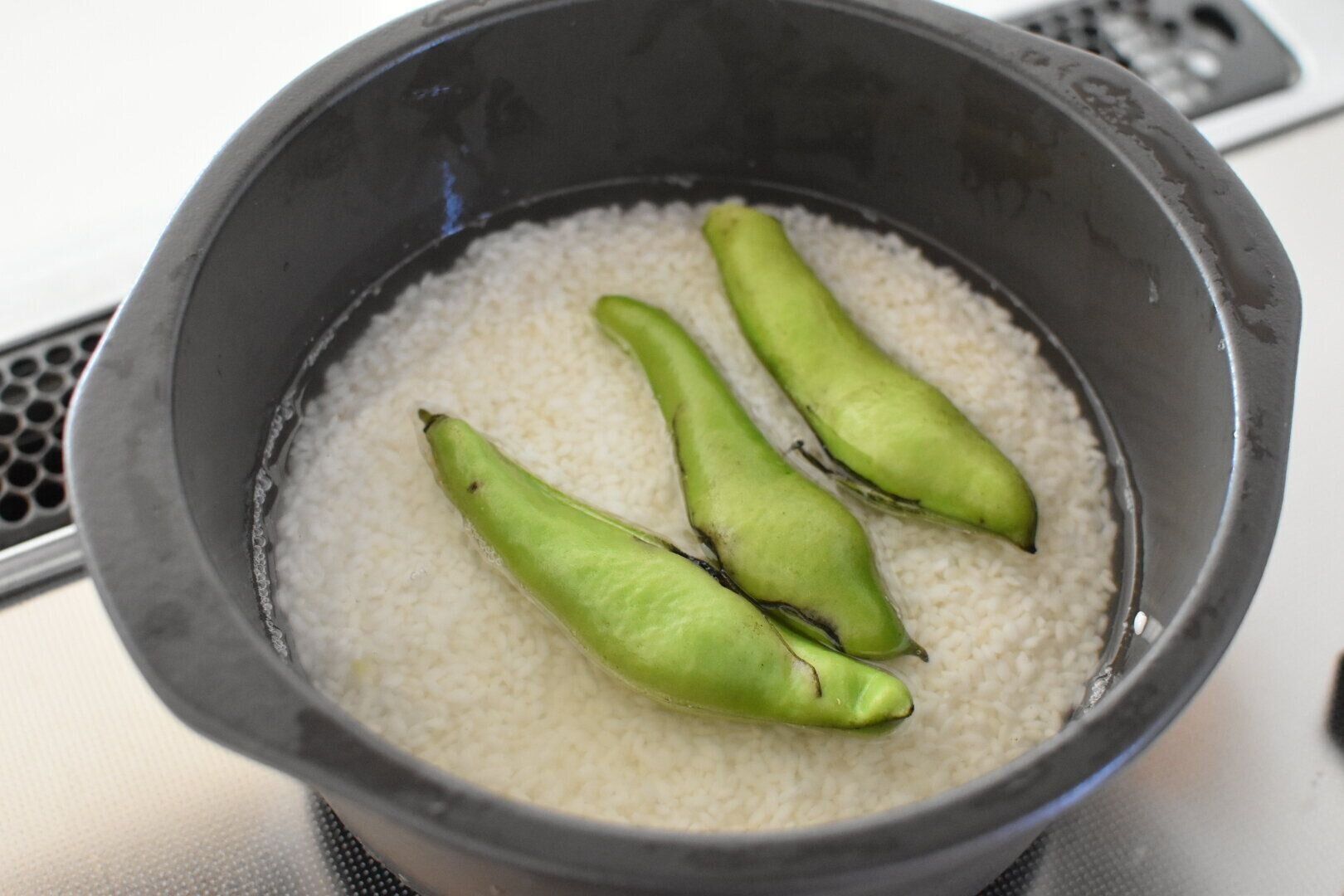 1.洗米したお米に調味料Aを混ぜて2合分の水を入れ、そら豆のさやを3個ほどお米の上において通常通りに炊飯する