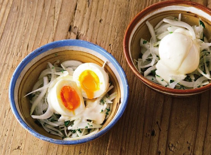 新玉ねぎは薄切りにし、パセリを混ぜて器に盛る。半熟卵をのせ、[A]をかける。