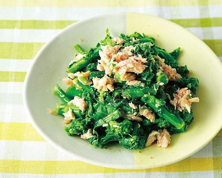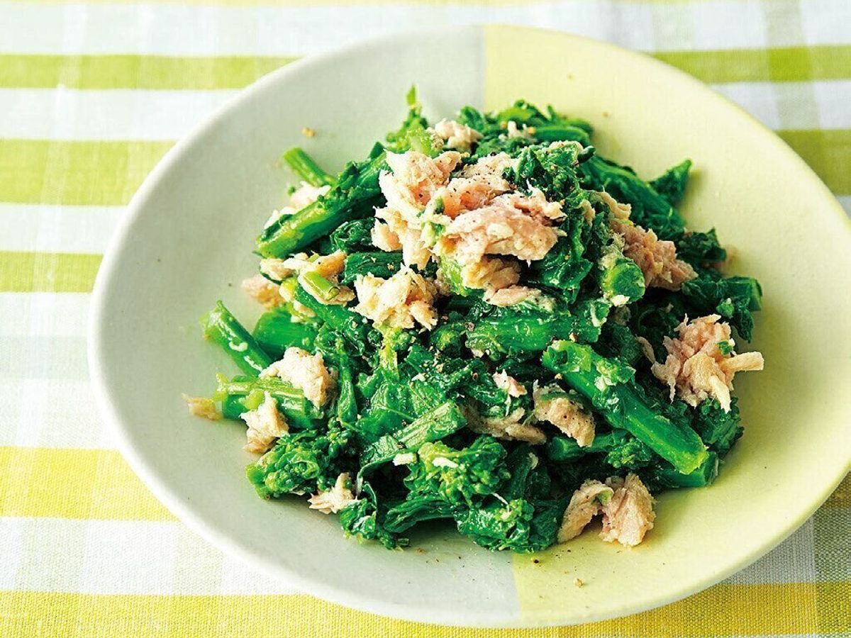 菜の花は塩少々を入れた湯で約1分30秒ゆでてざるに上げ、粗熱を取って水けをきる。長さ2cmに切ってボウルに入れ、ツナ、[A]を加えてあえる。器に盛り、黒こしょう少々をふる。