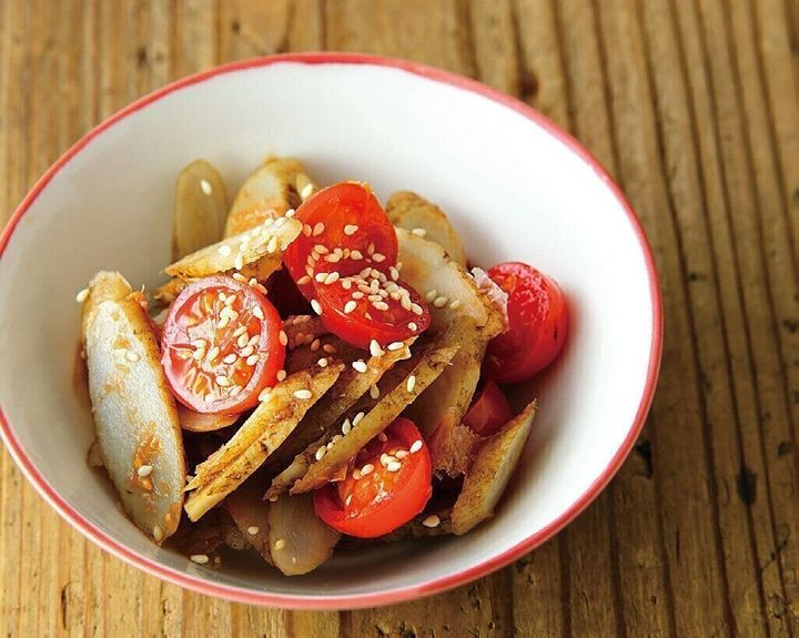 ごぼうは流水で洗い、斜めに薄切りにする。ミニトマトは半分に切る。鍋に湯を沸かしてごぼうを入れ、8分ゆでてざるに上げ、水けを拭く。粗熱が取れたら、ボウルにごぼう、ミニトマト、[A]を入れてあえ、削り節を加えて混ぜる。