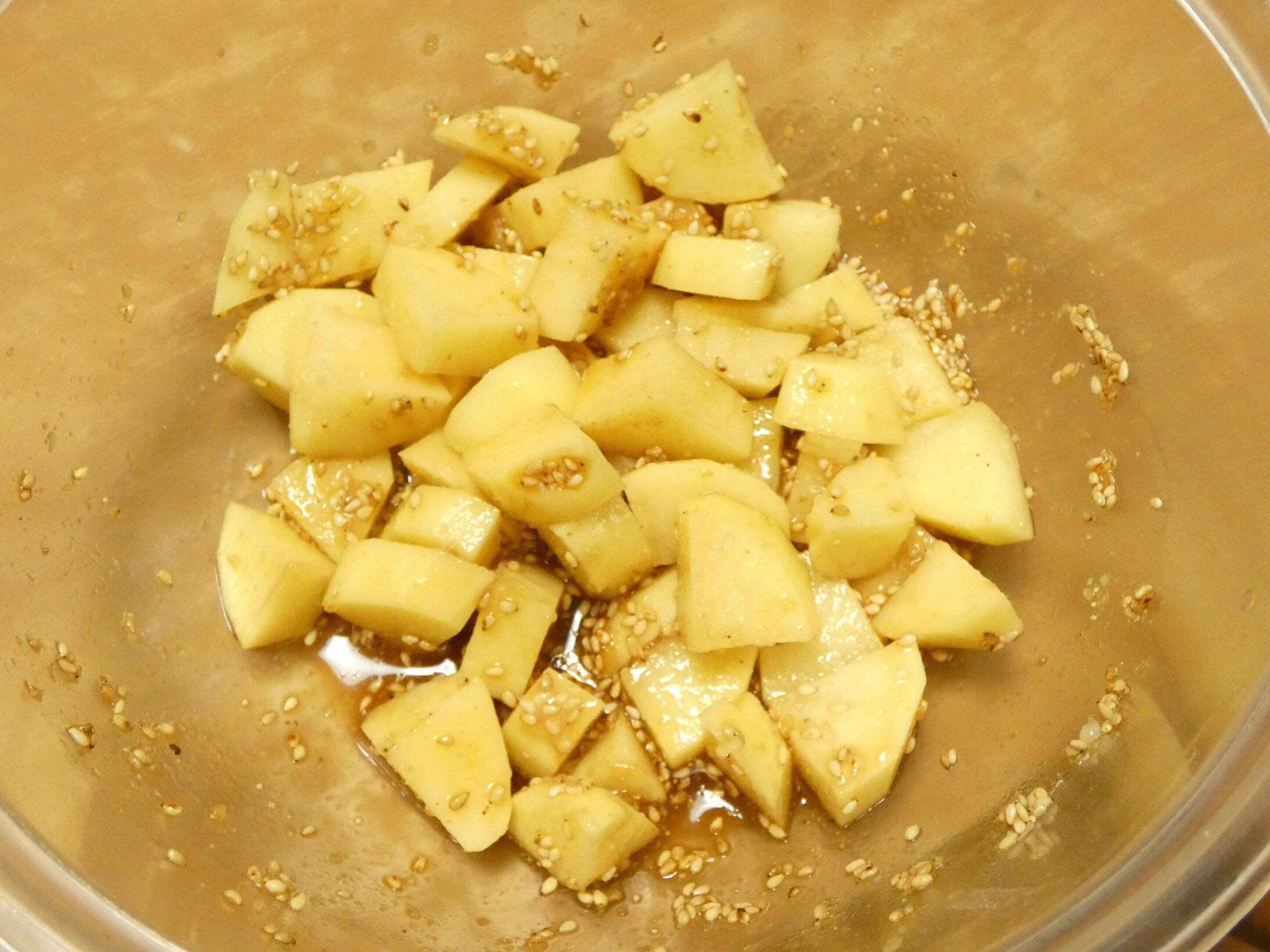 新じゃがを使う場合は皮つきでもOK。片栗粉を混ぜると味がよく絡みます。一度取りだし混ぜ合わせてからもう一度レンジ加熱すると、全体にムラなく火が通ります。