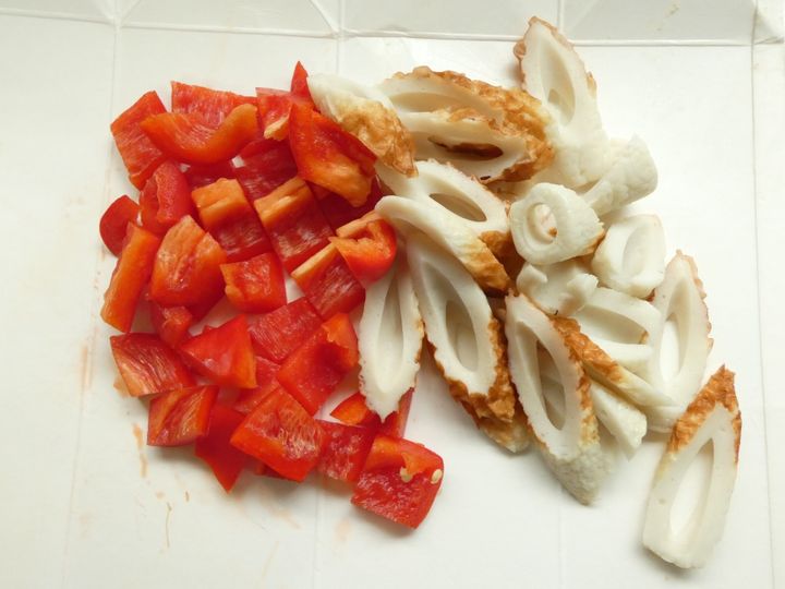 1.ちくわは斜めに薄切りにし、パプリカは1.5cm角に切ります。
