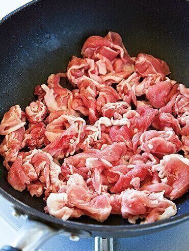 (3)豚肉を炒めて仕上げる