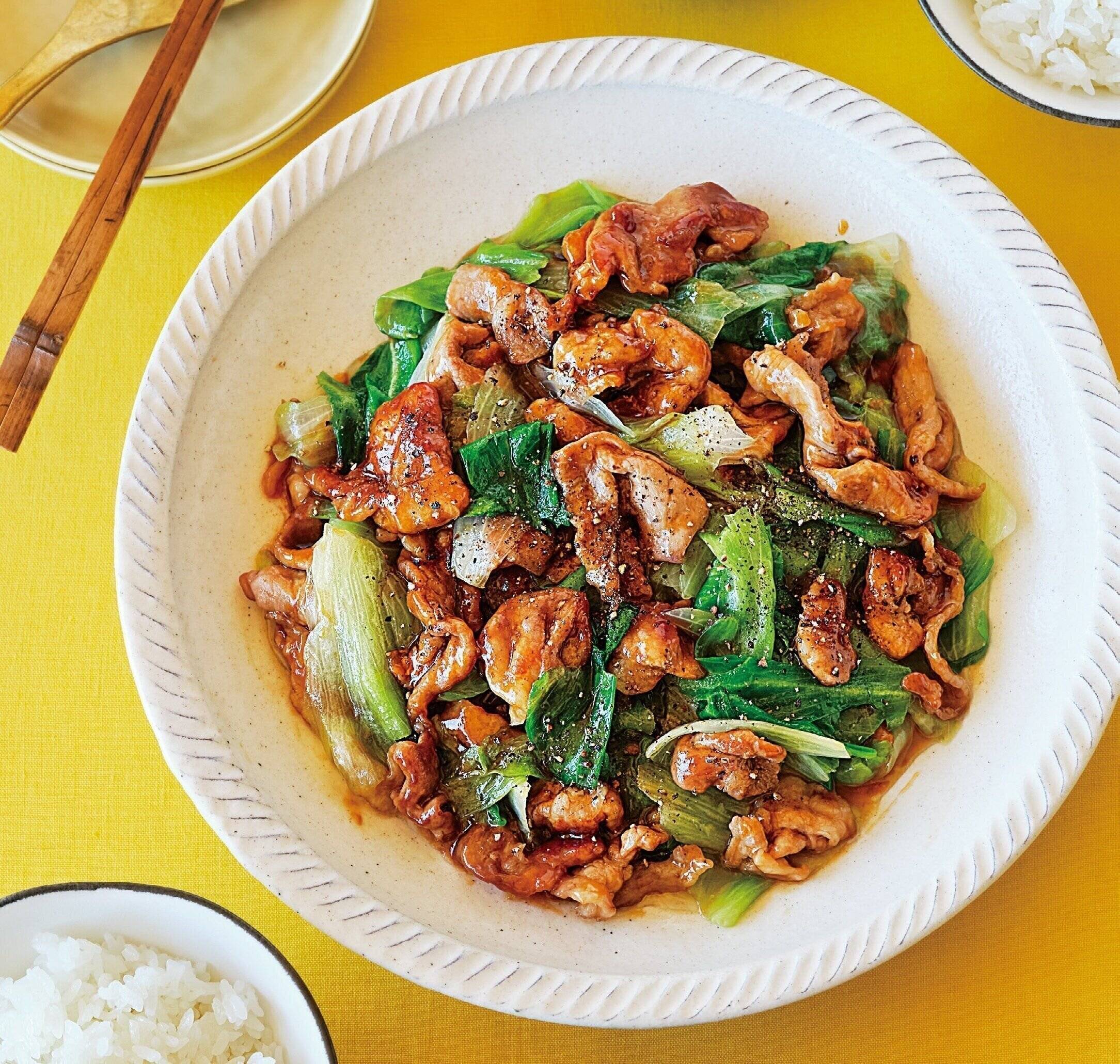 (2)のフライパンに油大さじ2を強めの中火で熱し、豚肉をざっと広げ入れる。こんがりした焼き色がつくまで動かさずに約1分焼きつけ、肉の色が変わるまで炒める。[A]を加え、照りよく炒め合わせる。(2)のレタスを戻してさっと混ぜ、器に盛って、黒こしょう適量をふる。