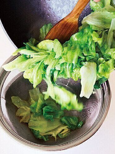 フライパンに油大さじ1を強めの中火で熱し、レタスをしんなりとするまで炒め、一度ざるに取り出す。