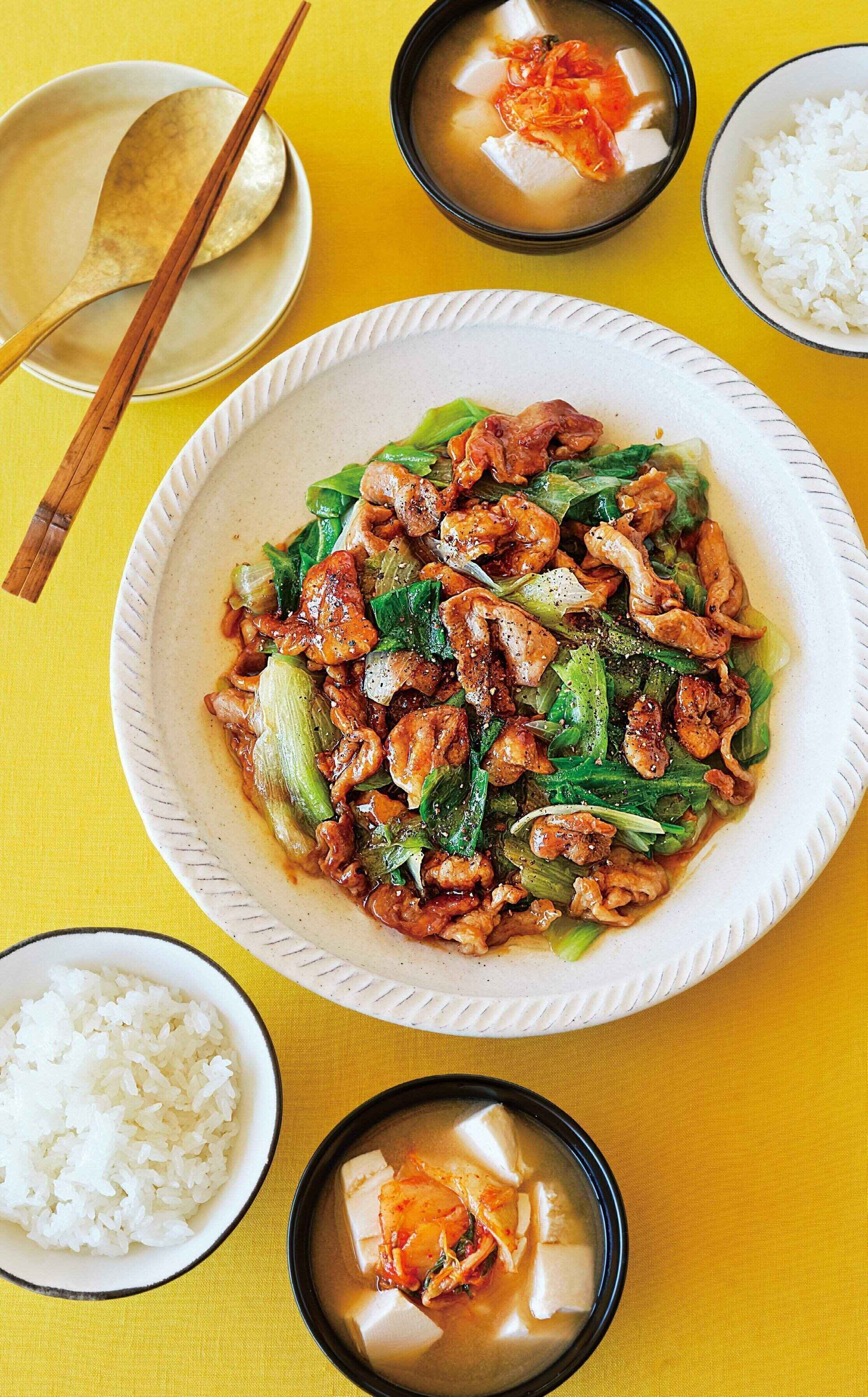 下ごしらえをしたら、だし汁を火にかけ、レタスをさっと炒めてから、豚肉を炒めて。みそ汁の豆腐を煮て、炒めもの、みそ汁の順に仕上げればラクラク20分で完成!豆腐もレタスも手でちぎって作るので、包丁を使わずにできるのも◎。