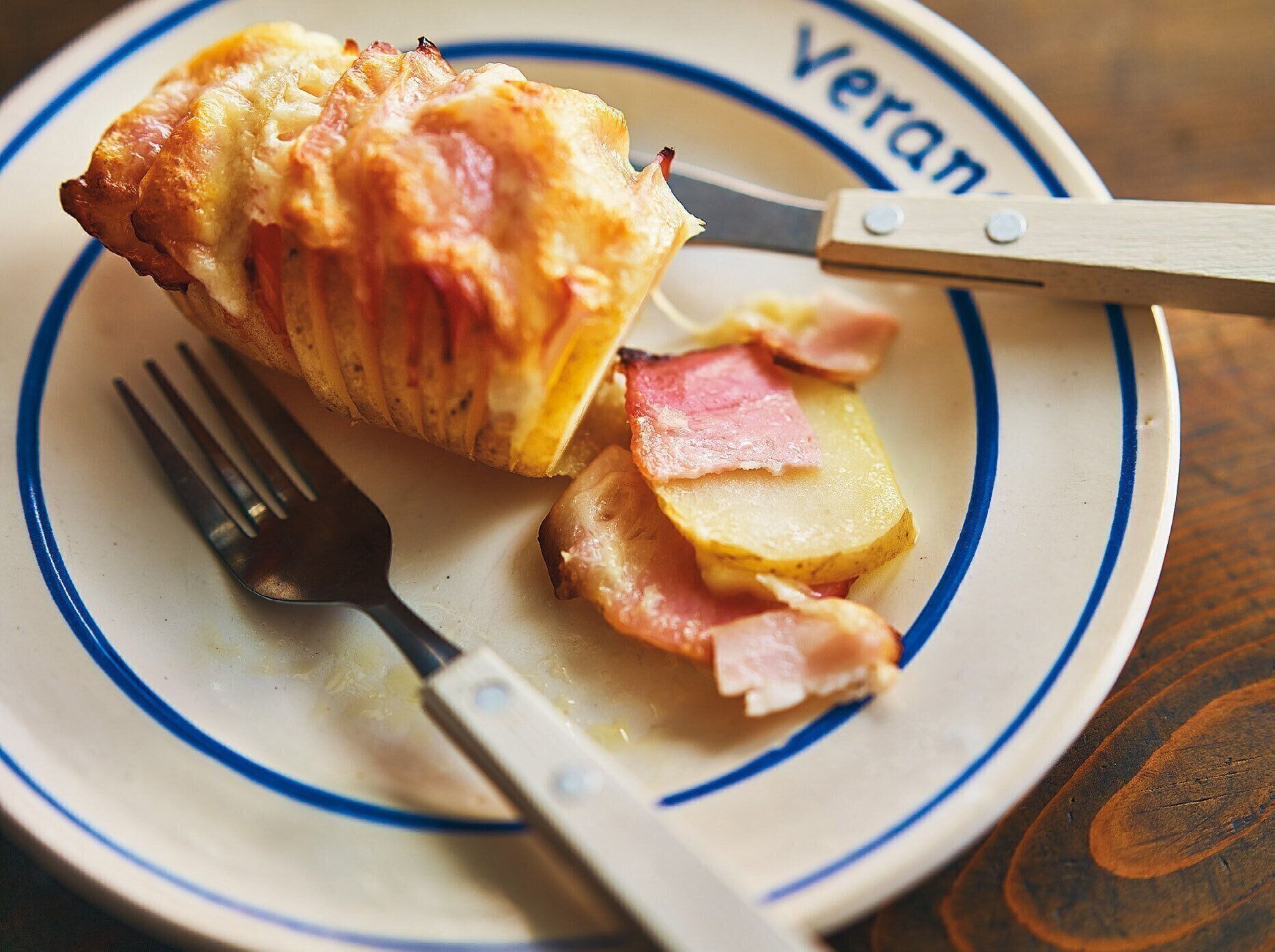 (2)ベーコンは6等分に切り、(1)の切り込みにはさむ。チーズを縦半分に切り、重ねてじゃがいもにのせる。