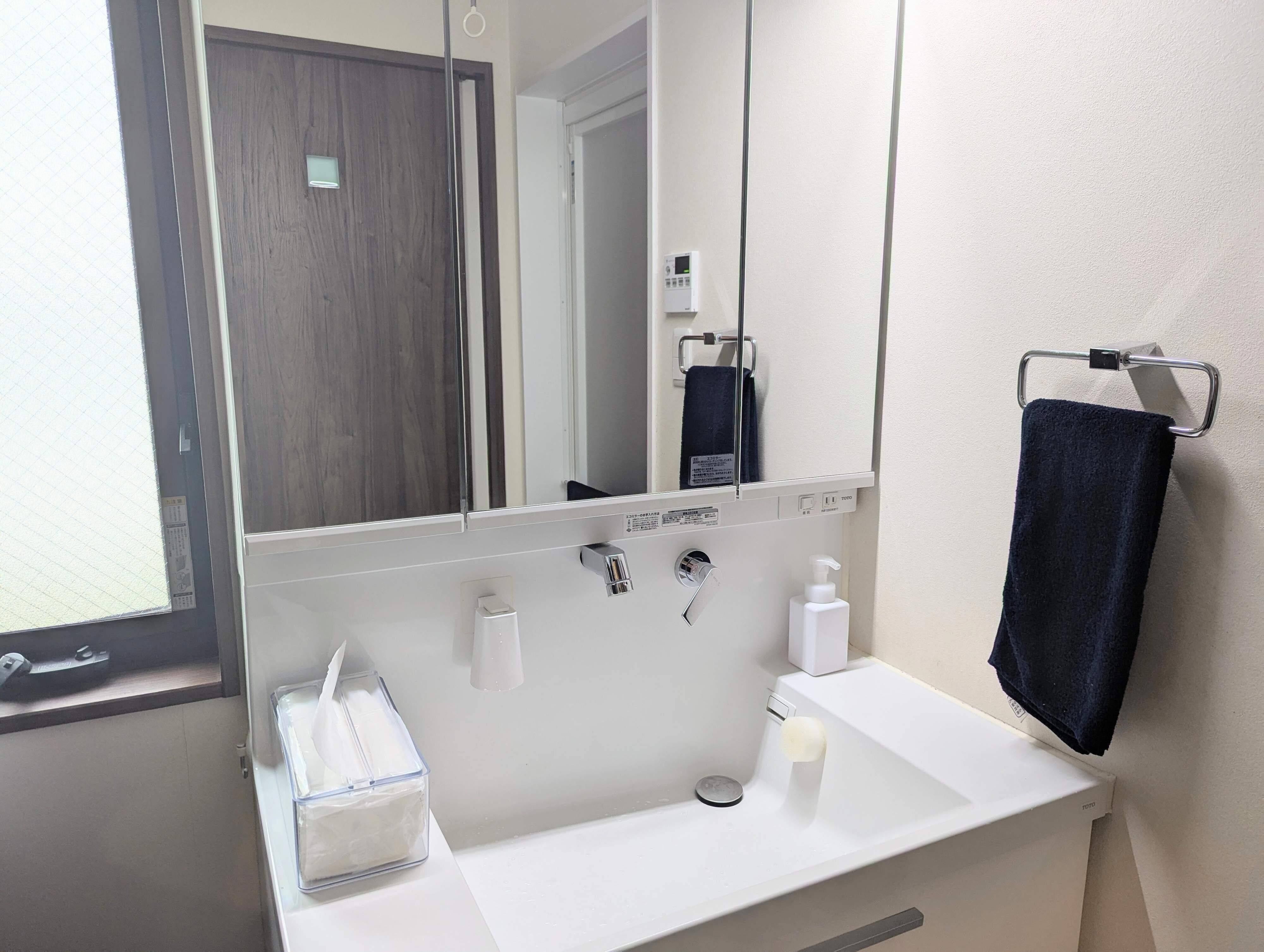 清潔感が伝わる場所でもあるので、いつもより丁寧に掃除をするのはマスト。くわえて、わが家では、鏡や水栓などの光る部分をマイクロファイバークロスでピカピカに磨く、換気扇フィルターのホコリが目立っていたら交換する、洗面所にペーパータオルを用意する、の3つを実践しています。このひと手間で清潔感がワンランクアップ。