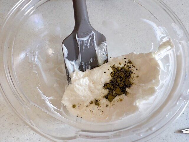 最後は和風!水切りしたヨーグルトに抹茶を混ぜました。粉っぽさが残らないようにしっかり混ぜます。