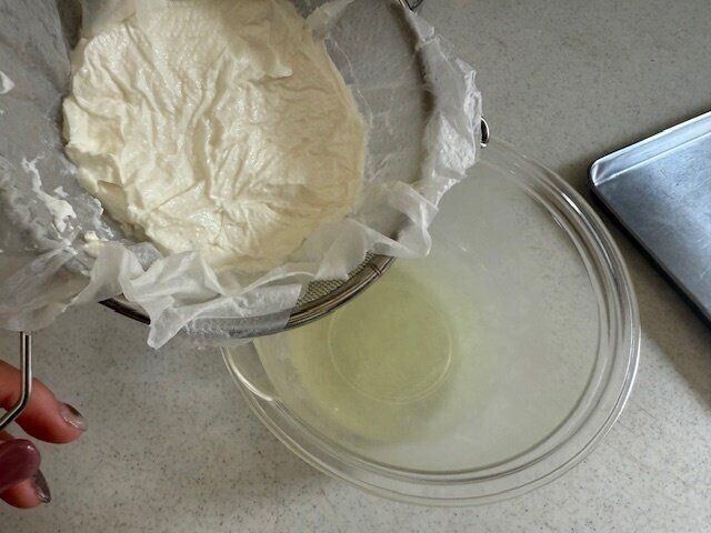 2~3時間でもこんなに水が切れました!今回は水切りヨーグルトのほうを使いますが、この残った水(ホエー)も料理やお米を炊くときの水としても使えますので、ぜひ使ってみてくださいね。