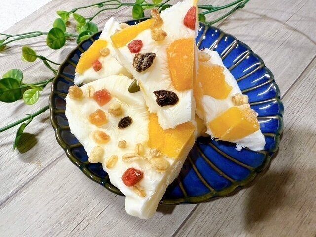 水切りヨーグルトを薄く広げて冷凍庫で固めるだけで、ヘルシーなのに見た目もおしゃれなスイーツに大変身。