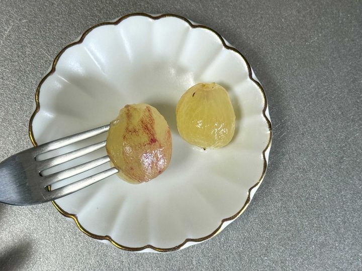 私はこれまで、ぶどうをひと粒ずつ手でむいていたのですが、青髪のテツさんの投稿で「ぶどうは湯むきすると楽にむける」と知って、思わず「えっ、湯むきってトマトだけじゃないの!?」と驚きました。さっそく実際にやってみましょう。