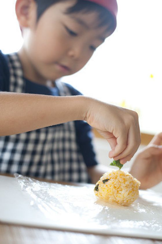 ご飯をラップでにぎったり、のりをつけたりするのは2〜3歳くらいからOK。年長さんくらいからは米とぎにチャレンジを!