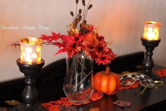 サンキュ!ブロガーバロンママさんはオレンジが悪目立ちしないように、キャンドルを左右に配置し、同じ暖色である光の印象で落ち着いた雰囲気を作っています。