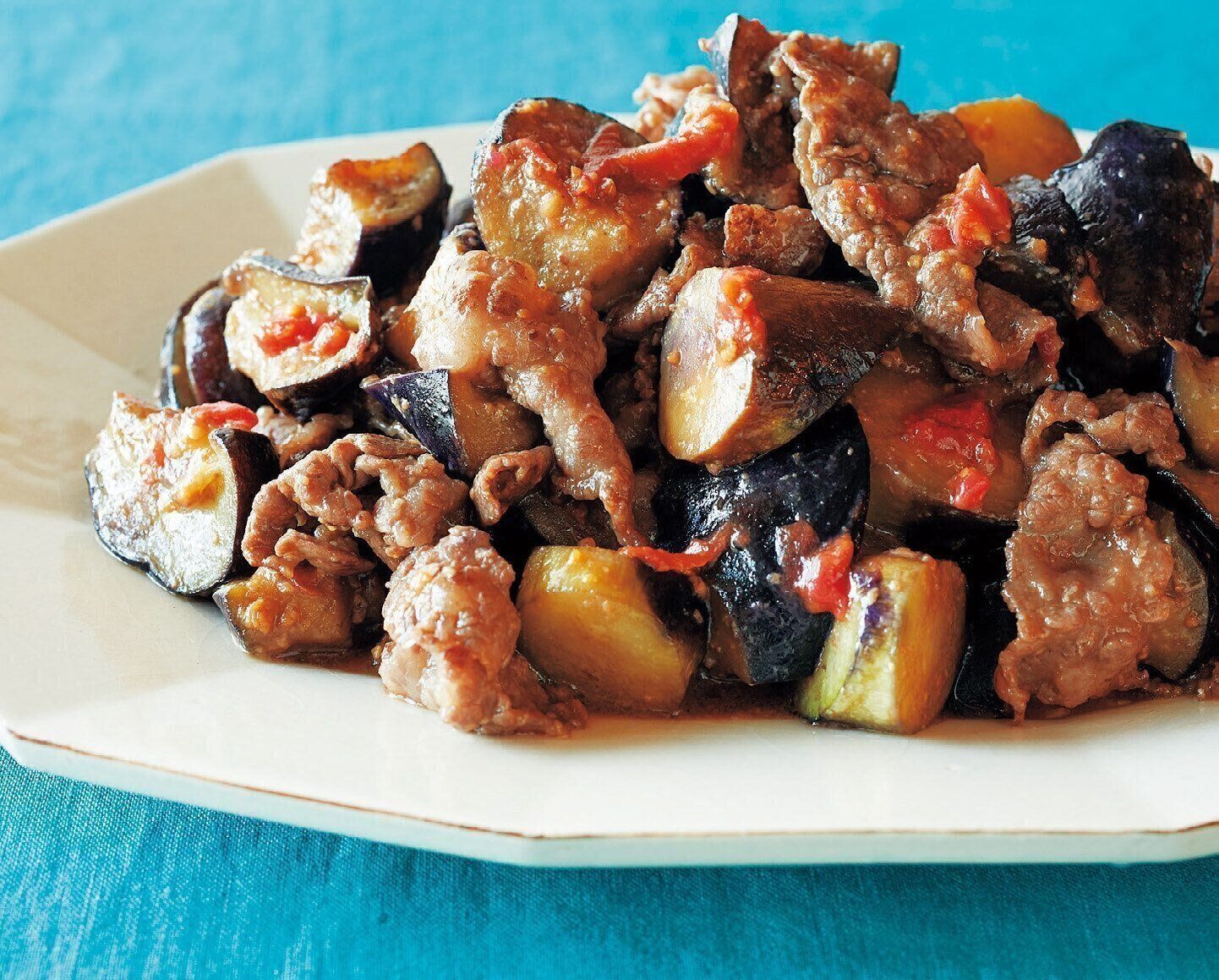 (1)フライパンにサラダ油を強めの中火で熱し、なすを炒める。焼き色がついてきたら牛肉を加え、牛肉をほぐしながら炒める。
