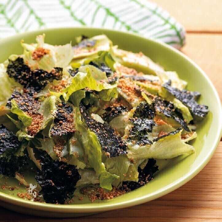 ちぎったレタスを韓国のり、ごま油、「めんたい粉」であえればピリ辛サラダに。かねふくのめんたいこを常温で常備できるのが◎。