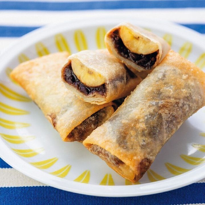 春巻きの皮にペーストとバナナをのせて巻き、油で揚げるだけ。甘過ぎないので大人もクセになるおいしさ。ナッツの食感も楽しい!