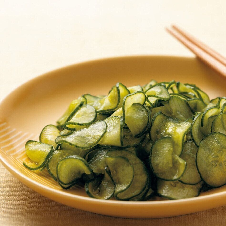 薄切りにしたきゅうりに塩をふって水気をとり、ごま油と「梅こんぶ茶」を少しかけて混ぜるだけ。この料理に使うためだけに常備してます。