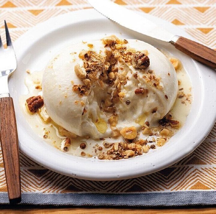 カルディのブッラータチーズにオリーブオイルと「デュカ」をかけるだけ。ナッツの香ばしさと、スパイスのうまみにハマりました。