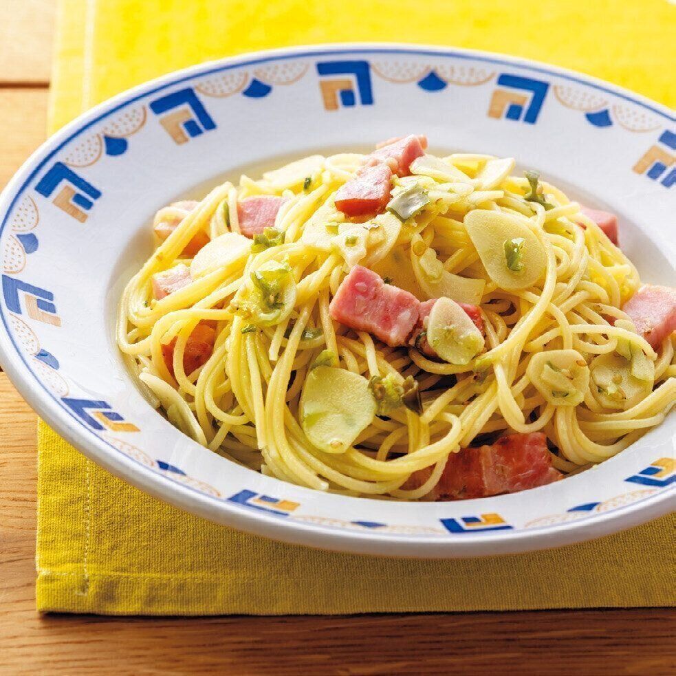 ベーコンと「青いにんにく辣油」をフライパンで軽く炒めて、ゆでたパスタをあえるだけ。うまみが凝縮されていて絶品です。