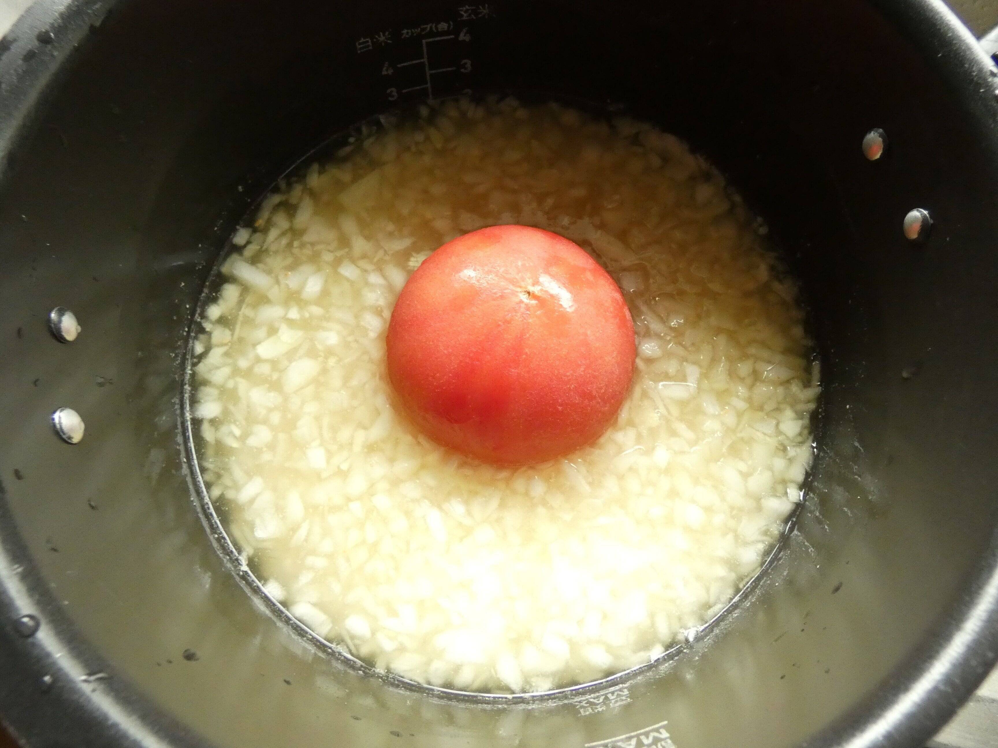 4.炊飯器に米とコンソメ、塩を入れて水を2合の目盛りより少なめに入れます。トマトと玉葱を入れてスイッチオン。
