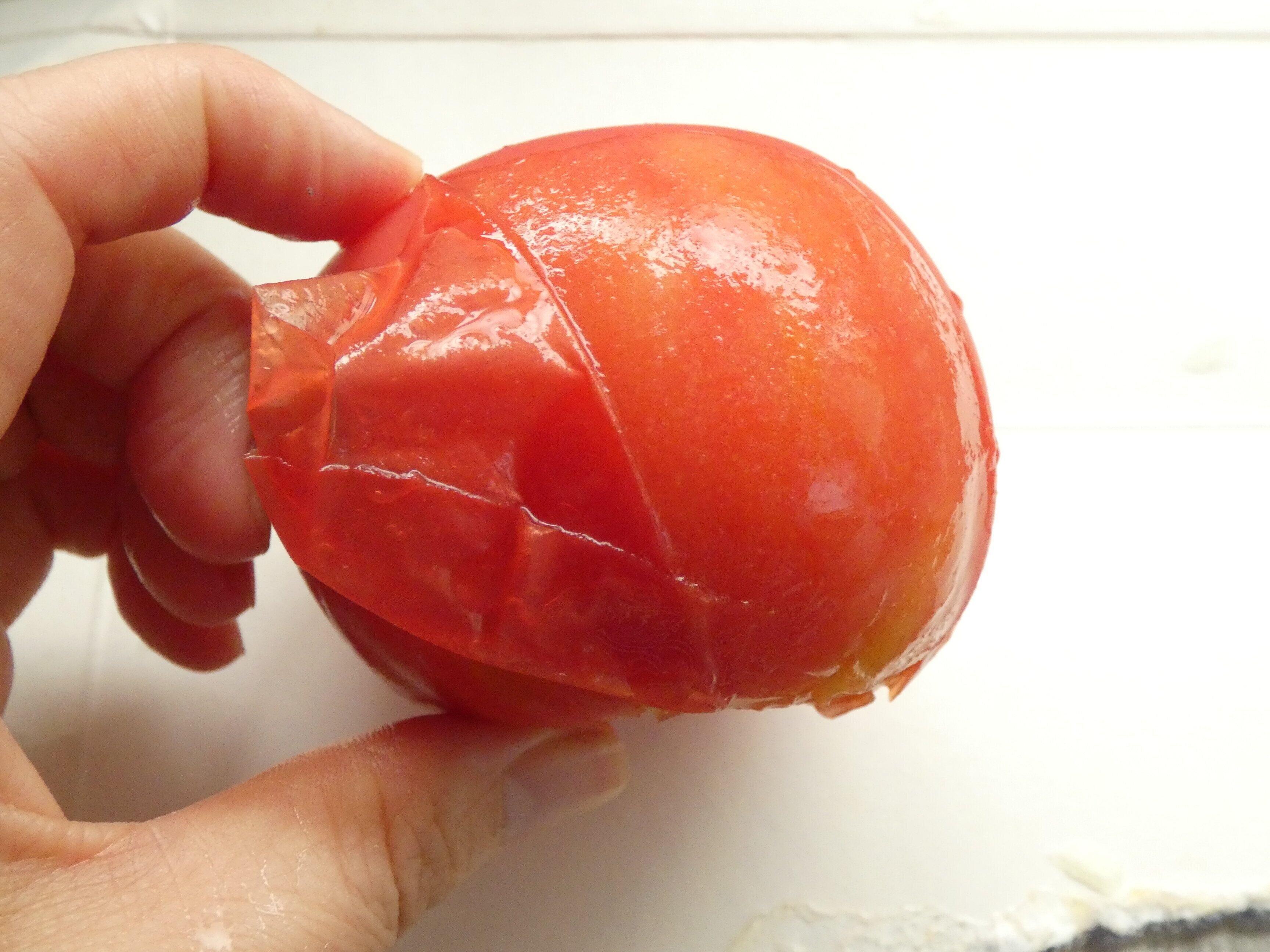 2.トマトはへたを取ってそのまま冷凍したものを使います。冷凍トマトに水をさっとかけて皮をむきます。