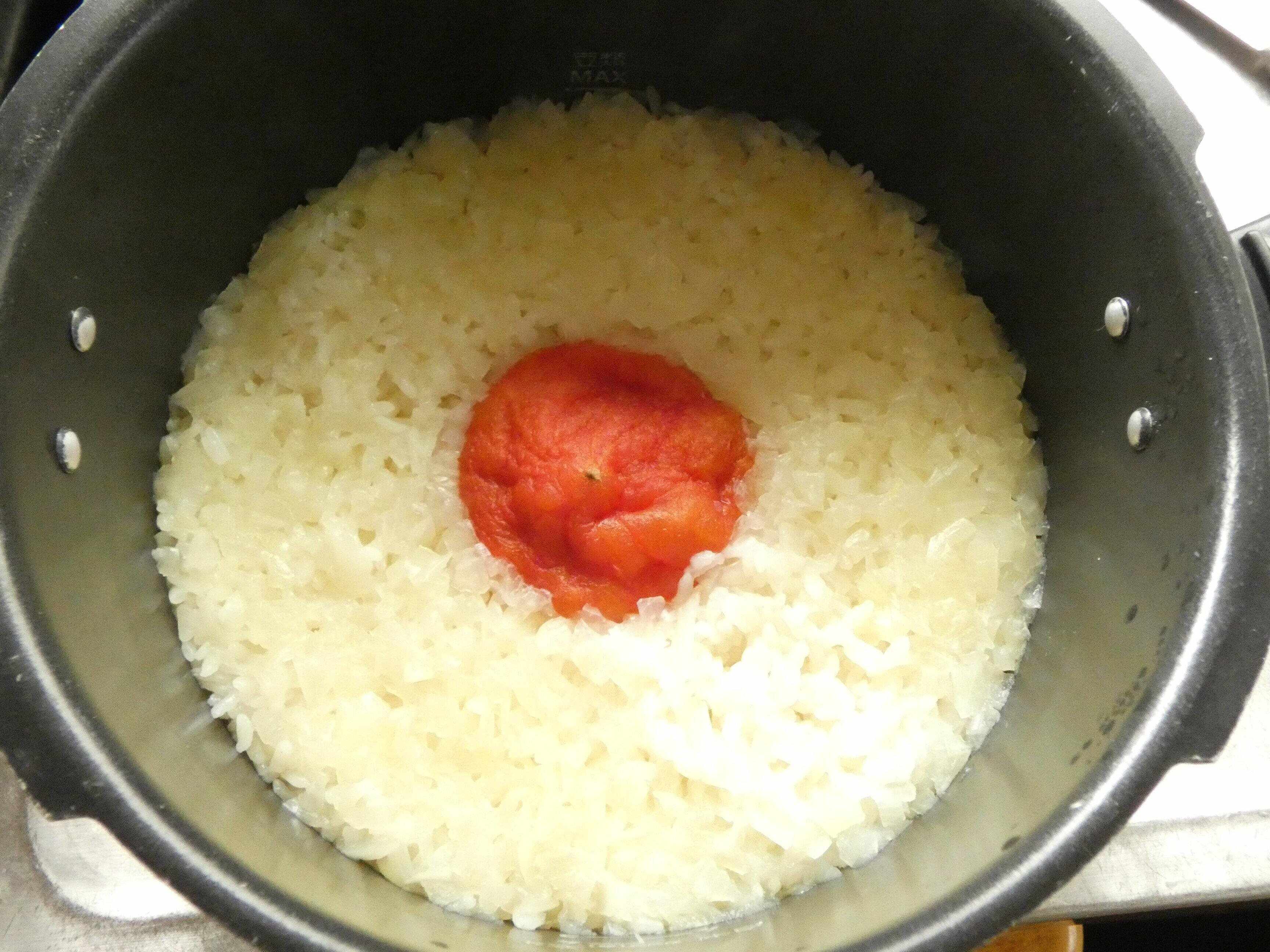 冷凍トマトを使うと湯むきの手間がなくていいです。トマトからも水分が出るので、水の量を減らすとご飯が軟らかくなりすぎません。
