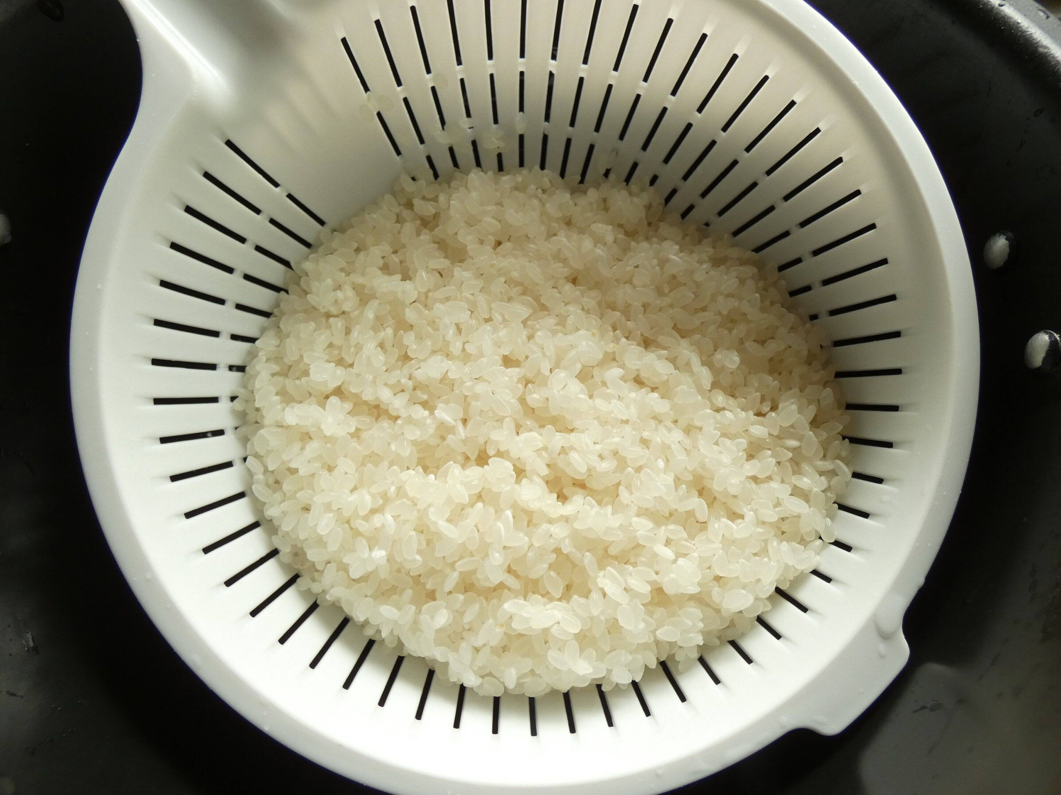 1.米をといでざるにあげ、しっかり水切りしておきます。