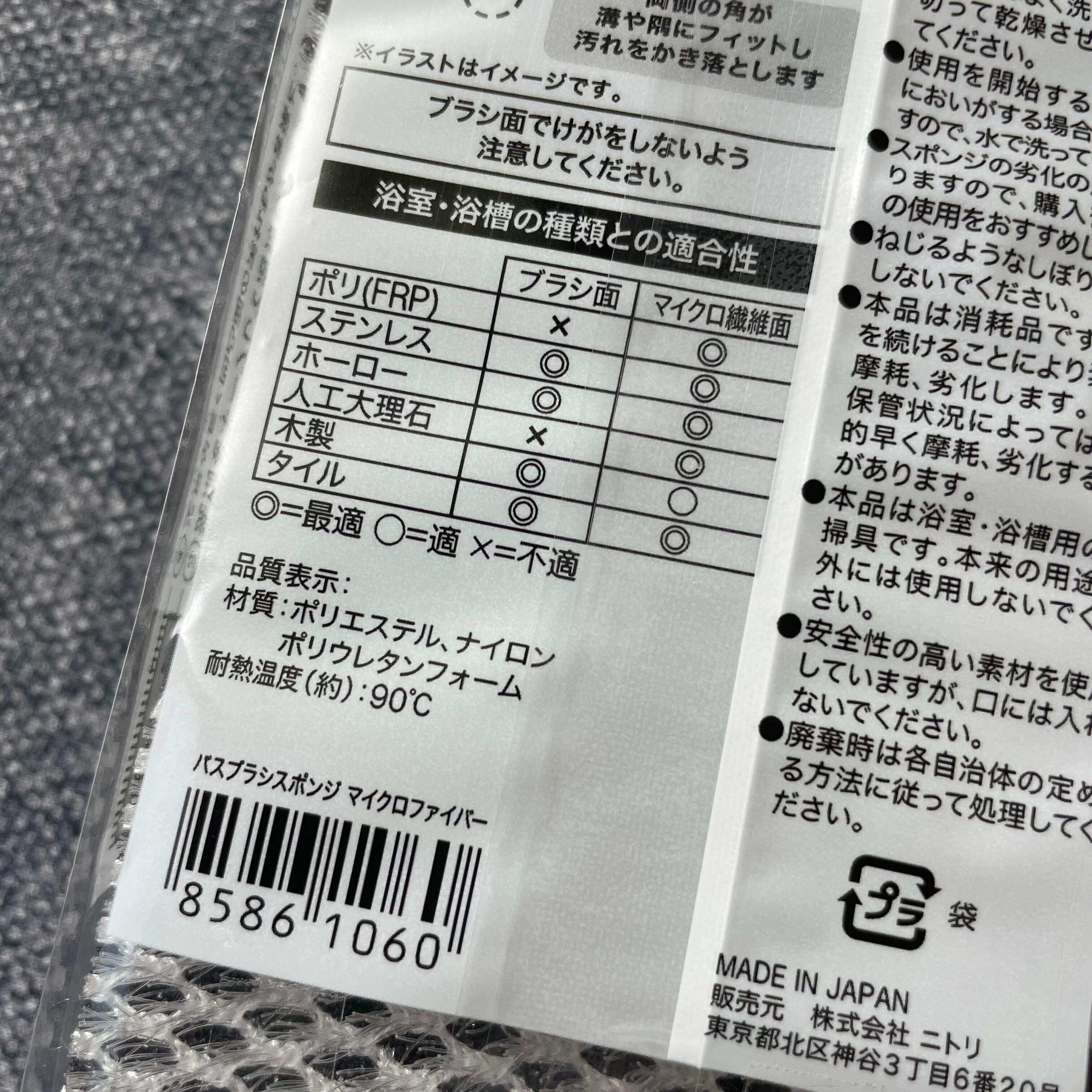 ニトリの「水だけで洗えるバスブラシスポンジ マイクロファイバー」を使えば、基本は水だけでOKなので、洗剤を使ってのお風呂掃除頻度を下げることができます。