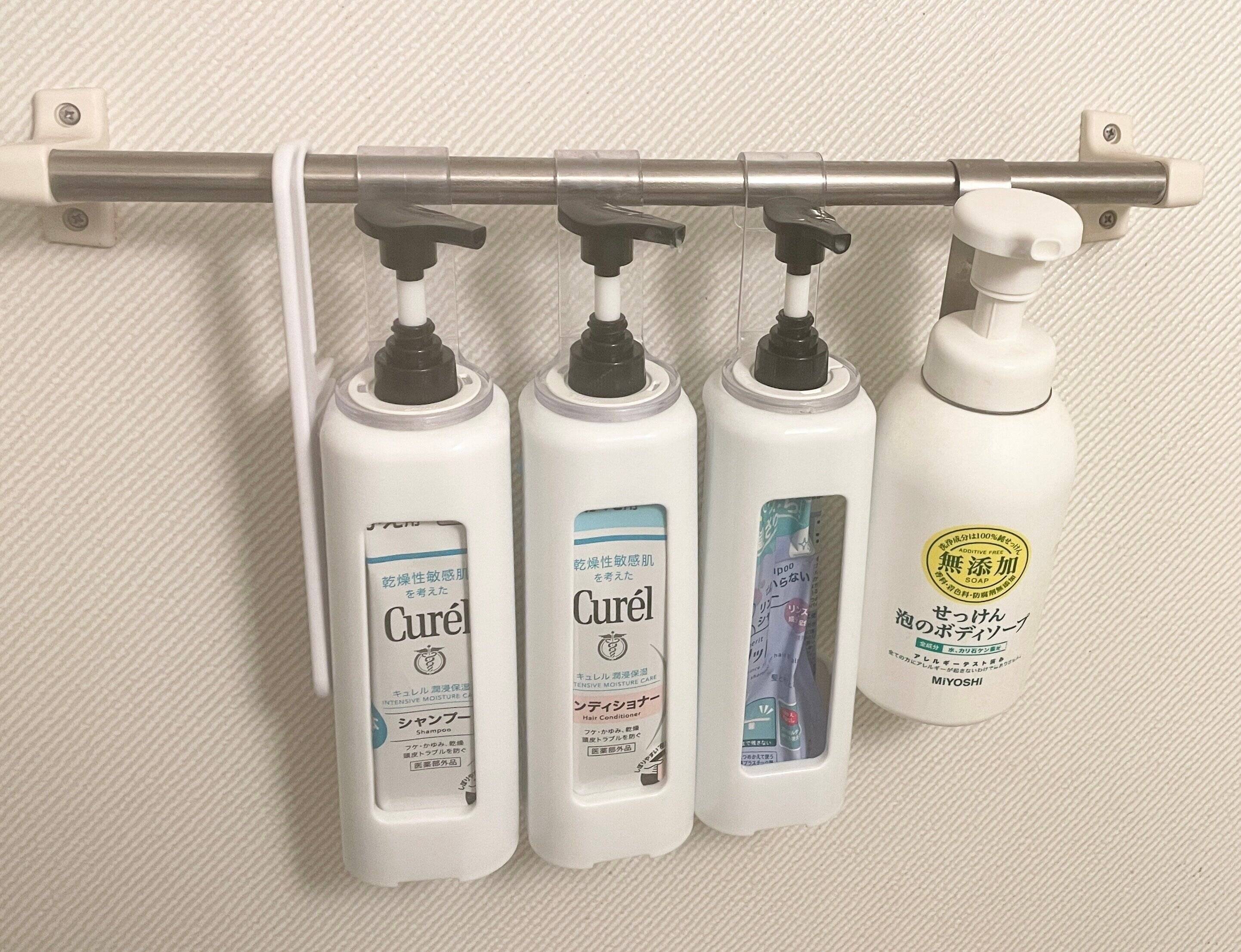 最近では、ボトルをタオルバーにかけて浮かせるハンギングフックや、詰め替えをそのまま使って浮かせるグッズが100均でも販売されています。