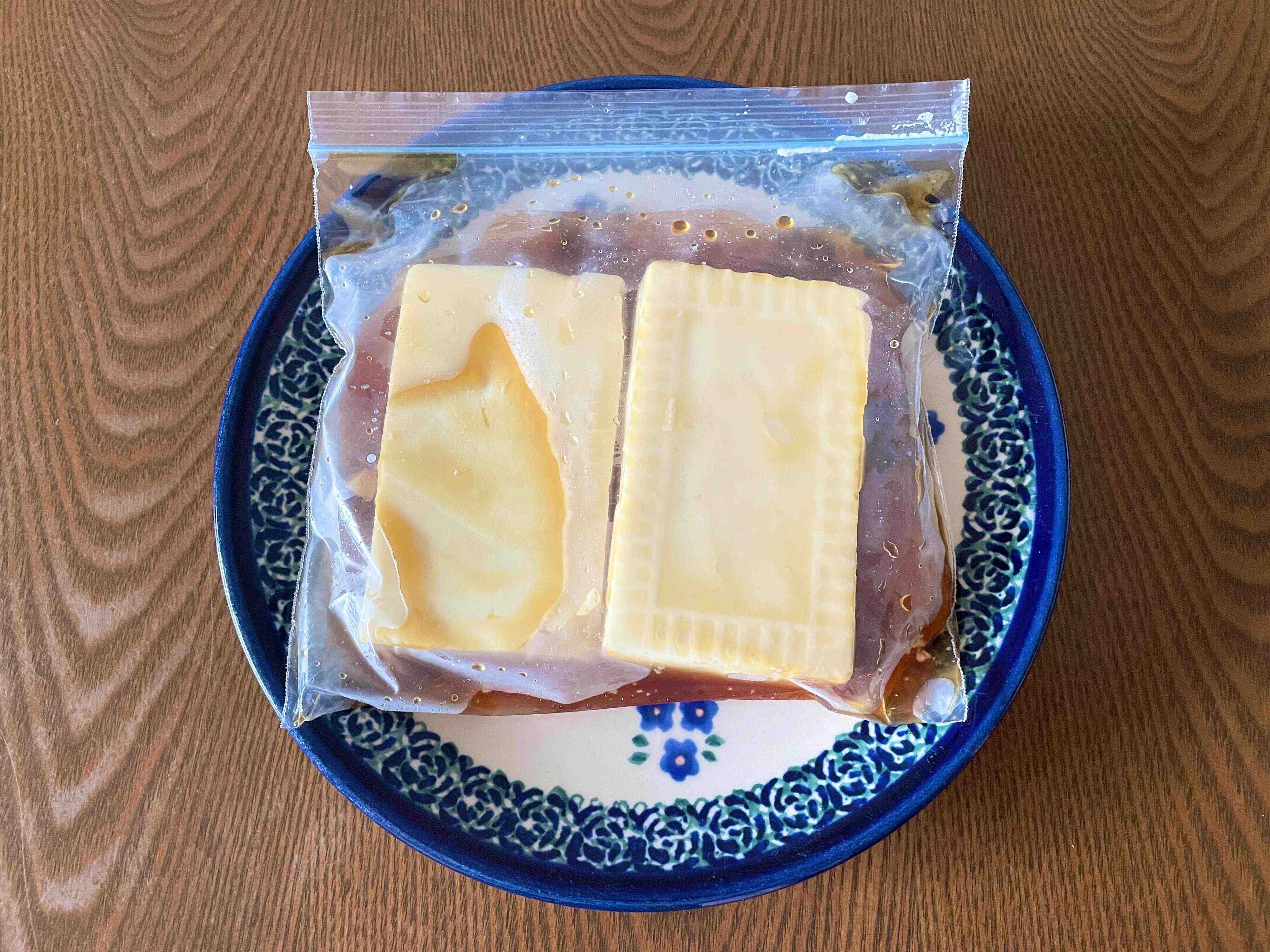 2.ポリ袋かジッパー付き袋に豆腐とめんつゆを一緒に入れて半日程度漬ける。途中で上下をひっくり返すとムラなく漬かります。