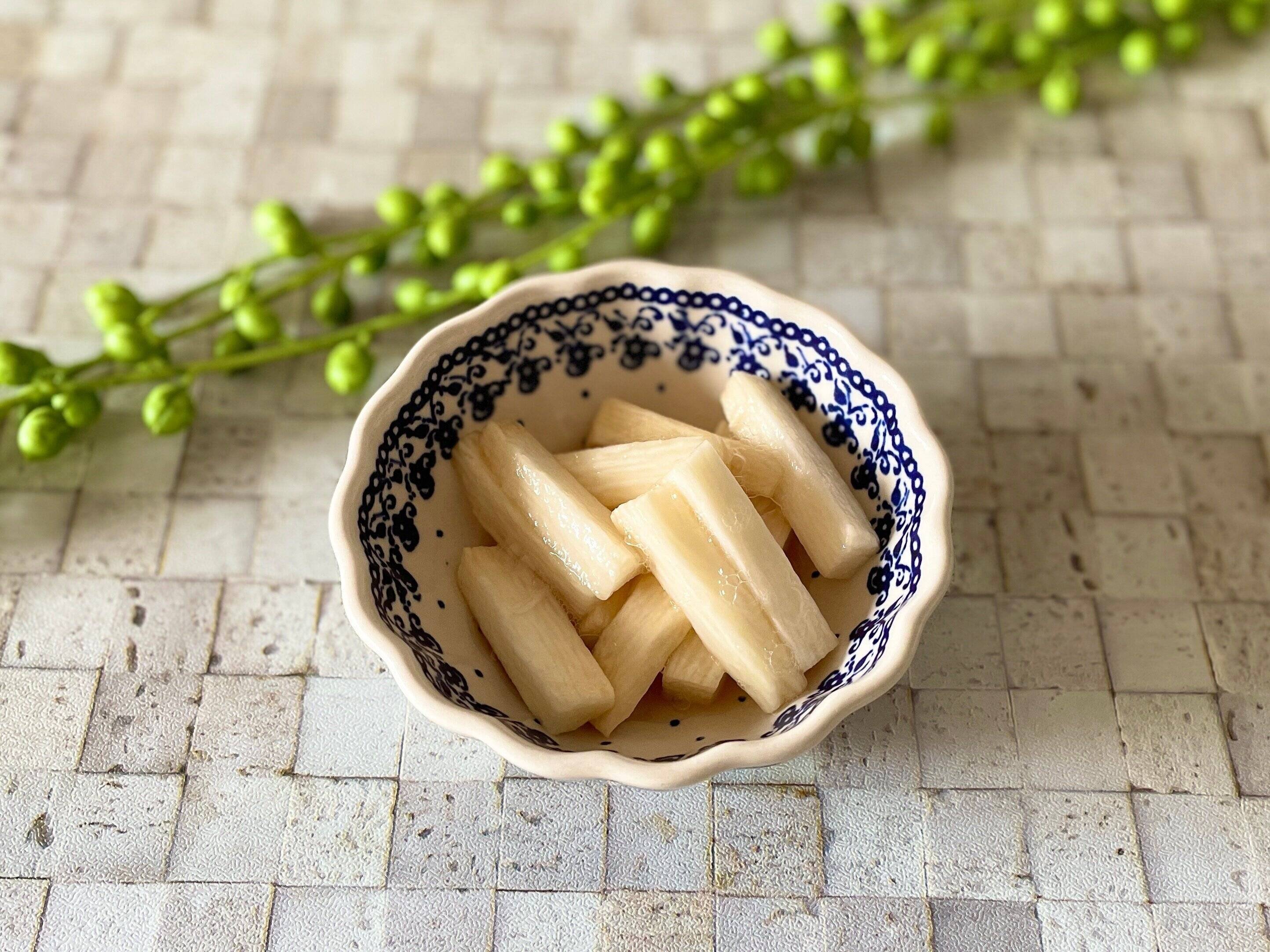こちらも、おつまみにもおかずにもおやつにもできる長芋漬けです。長めに漬けた方がおいしいですよ。ぽりぽりサクサクとまらないおいしさです。