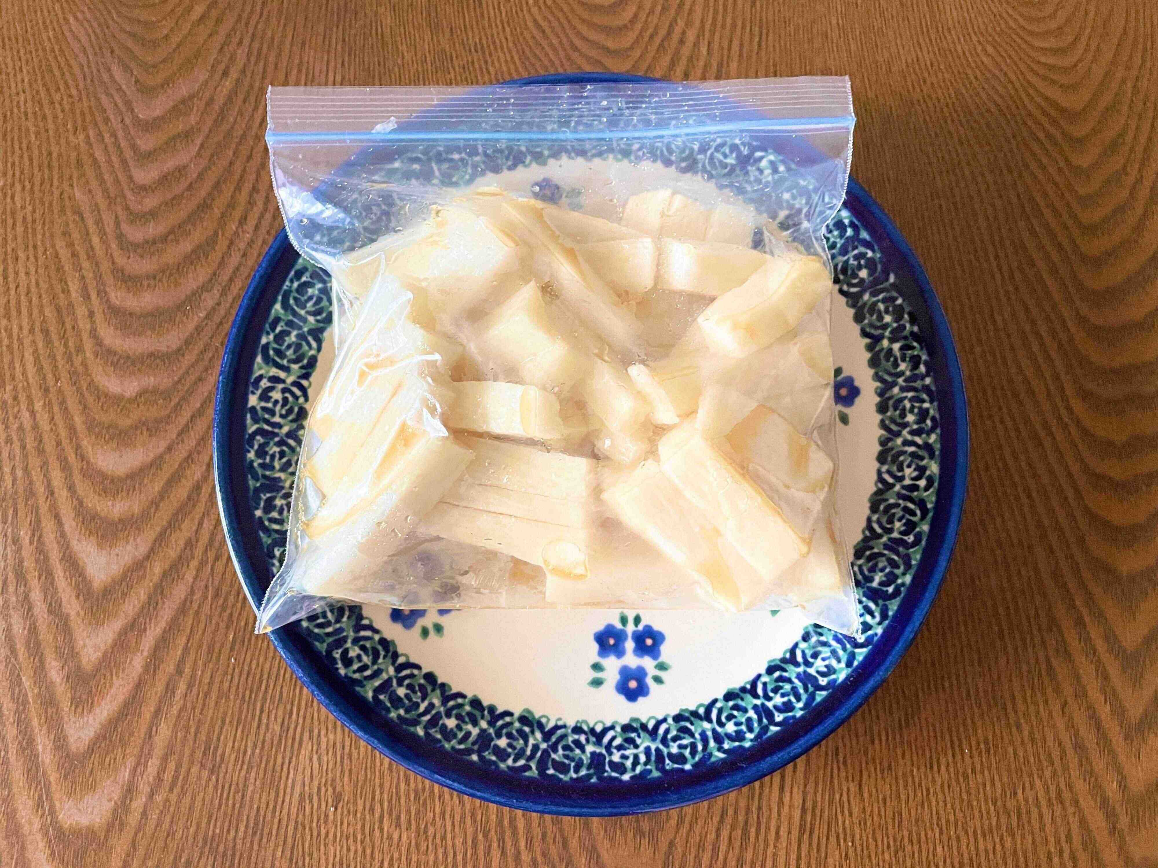 2.ポリ袋やジッパー付き袋にめんつゆと一緒に入れ、半日程度漬けこめばできあがり。