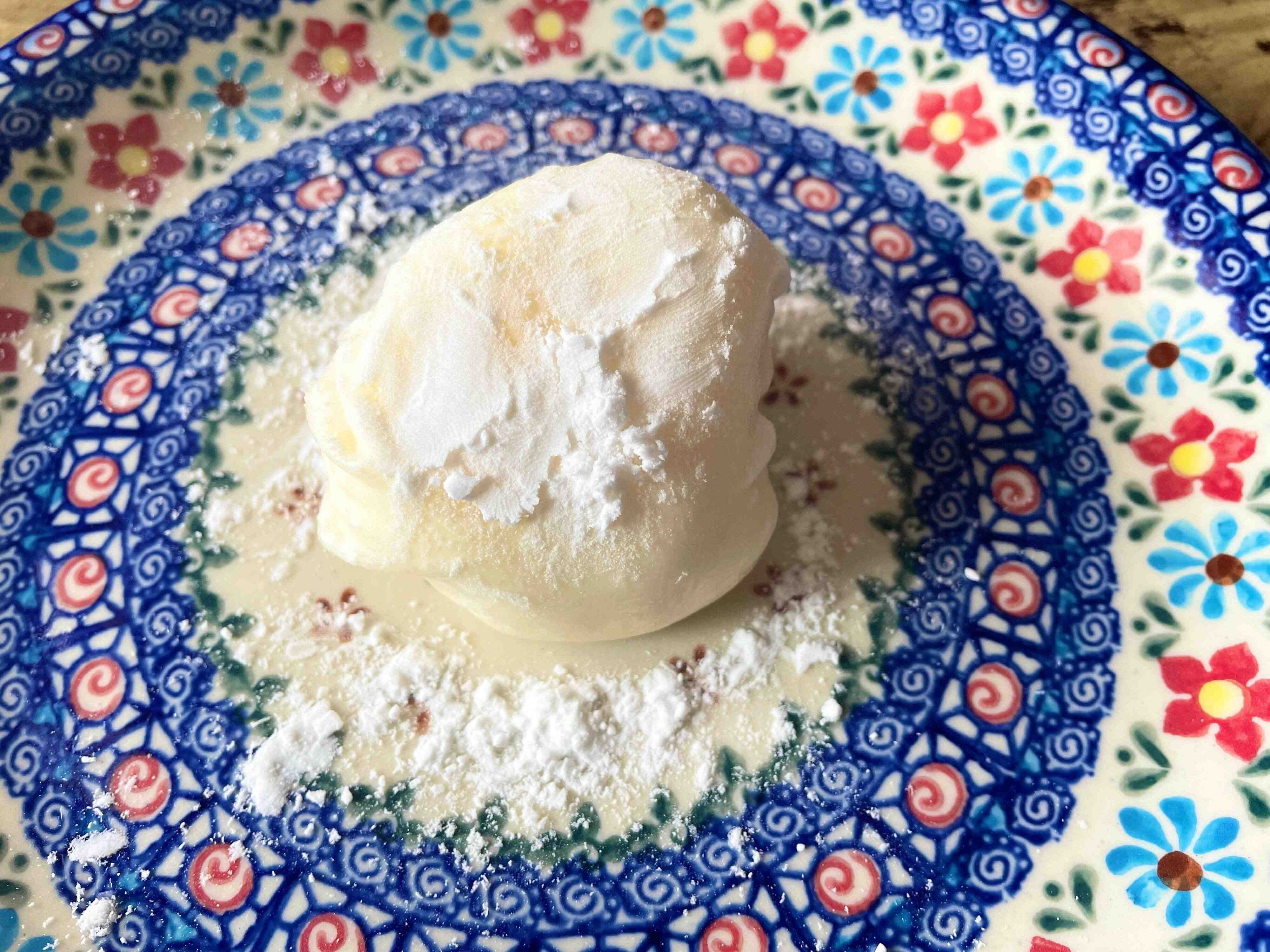ひっくり返して包み目をしたにしたら、上から片栗粉を適量ふって全体にまぶし、少し形を整えます。