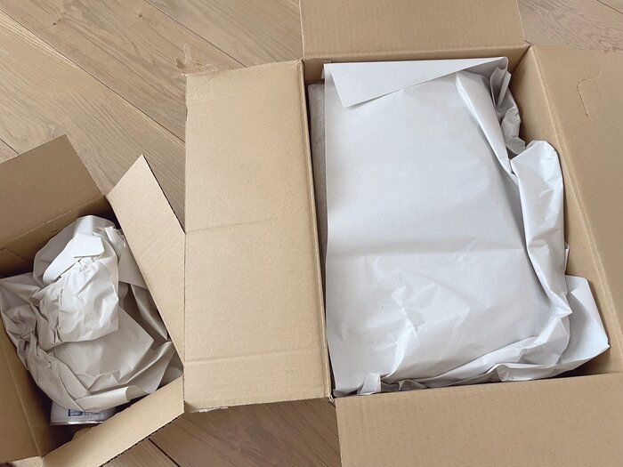 くしゃくしゃに丸めたりして隙間に入っている紙製の緩衝材。