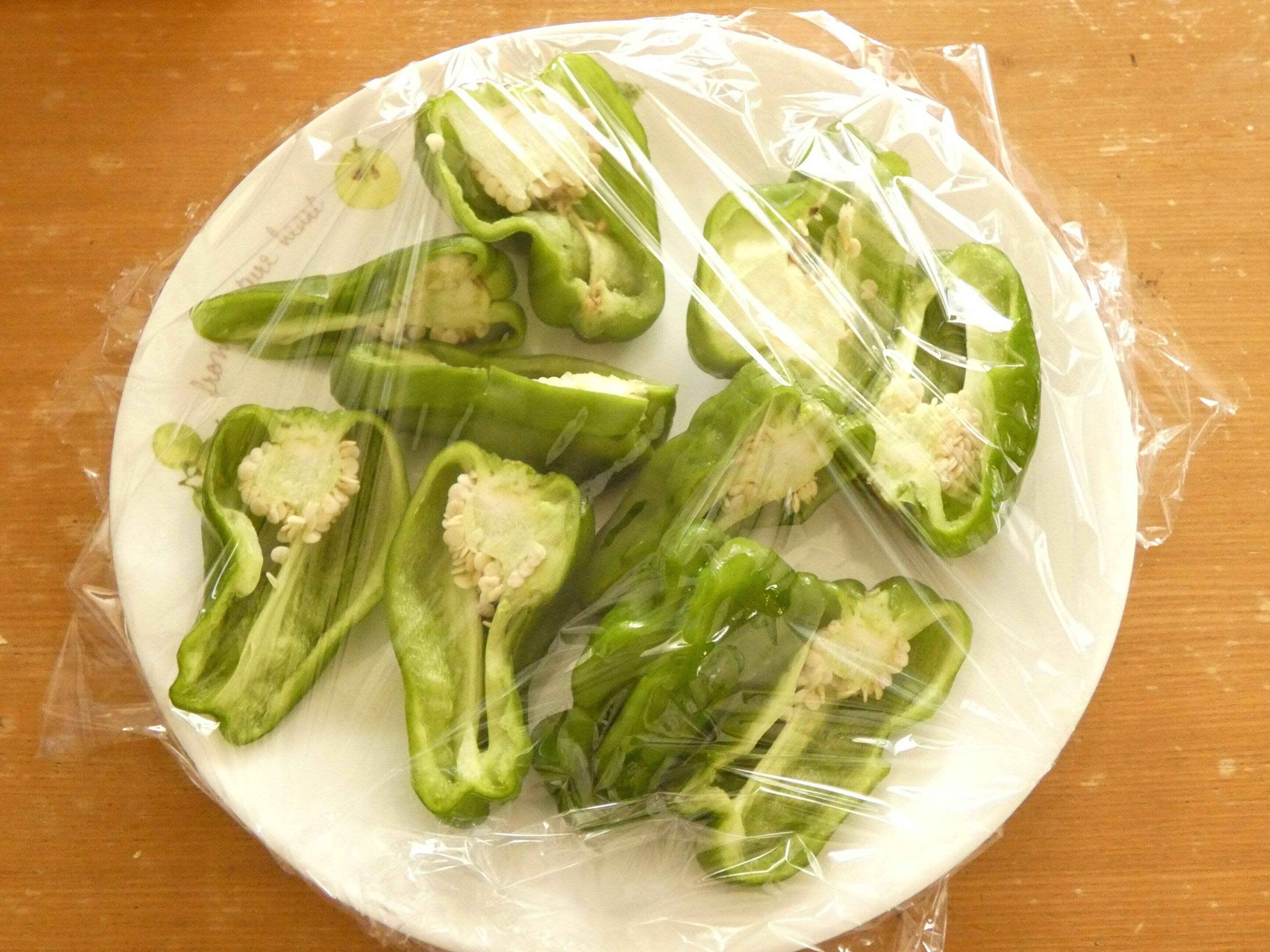 2.ピーマンは種ごと半分に切ります。耐熱容器に並べてふんわりラップをし、電子レンジ600Wで4分加熱します。