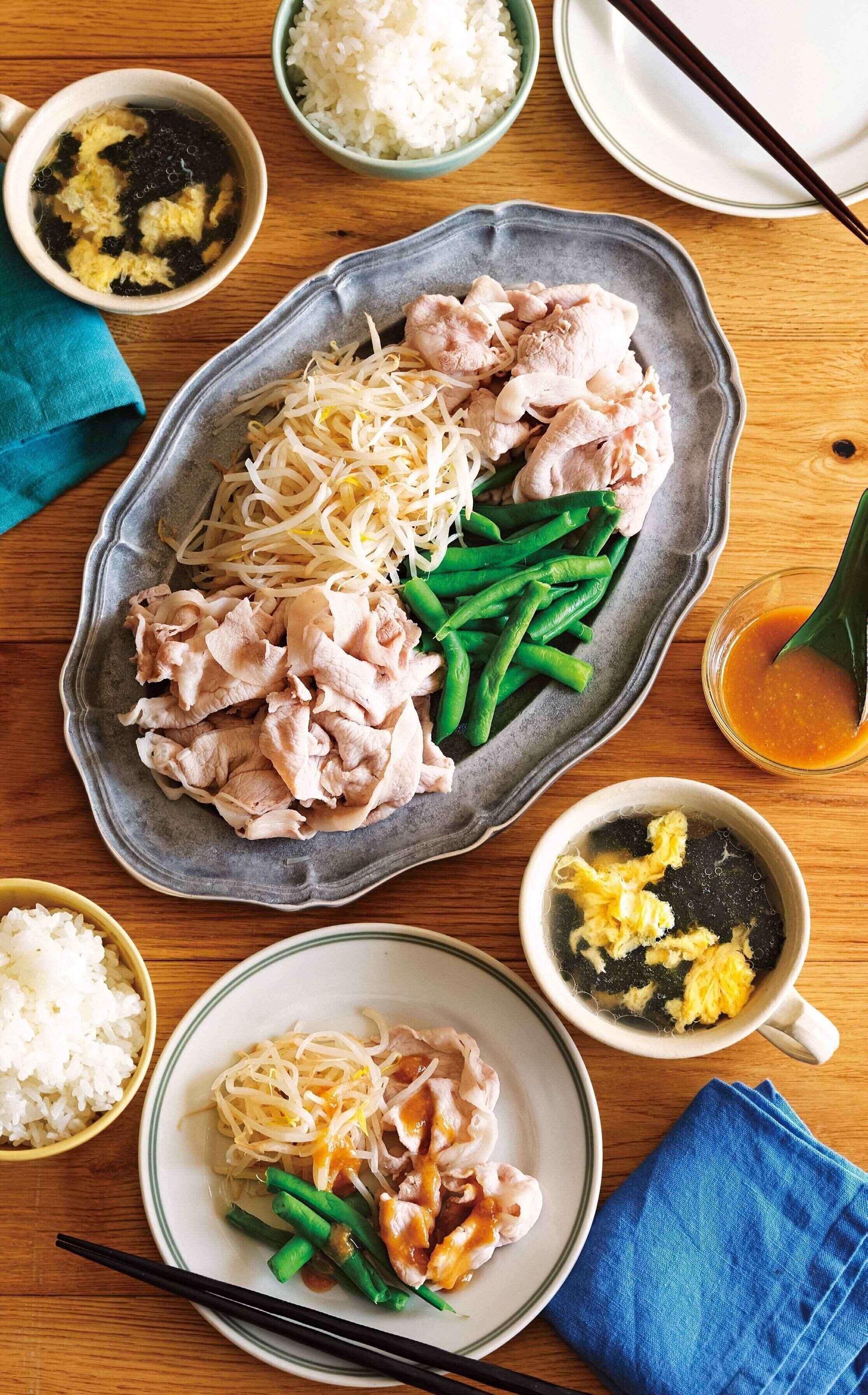 簡単甘酢みそだれは豚肉と一緒に野菜がたくさん食べられる!鍋に湯を沸かし、いんげん、もやし、豚肉の順にゆでます。そのゆで汁でスープを作れば、鍋ひとつで2品が完成!まな板と包丁も使わないから洗い物も最小限!