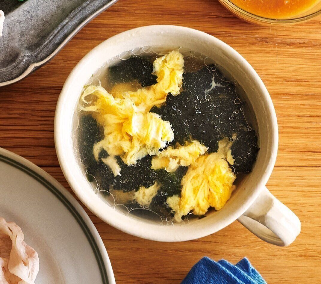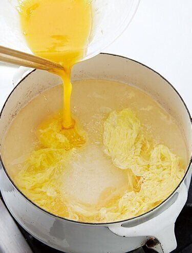 沸騰したら中火にして、卵を溶きほぐし、細く流して回し入れる。大きく汁をひと混ぜし、盛りつける直前にのりをちぎって入れる。