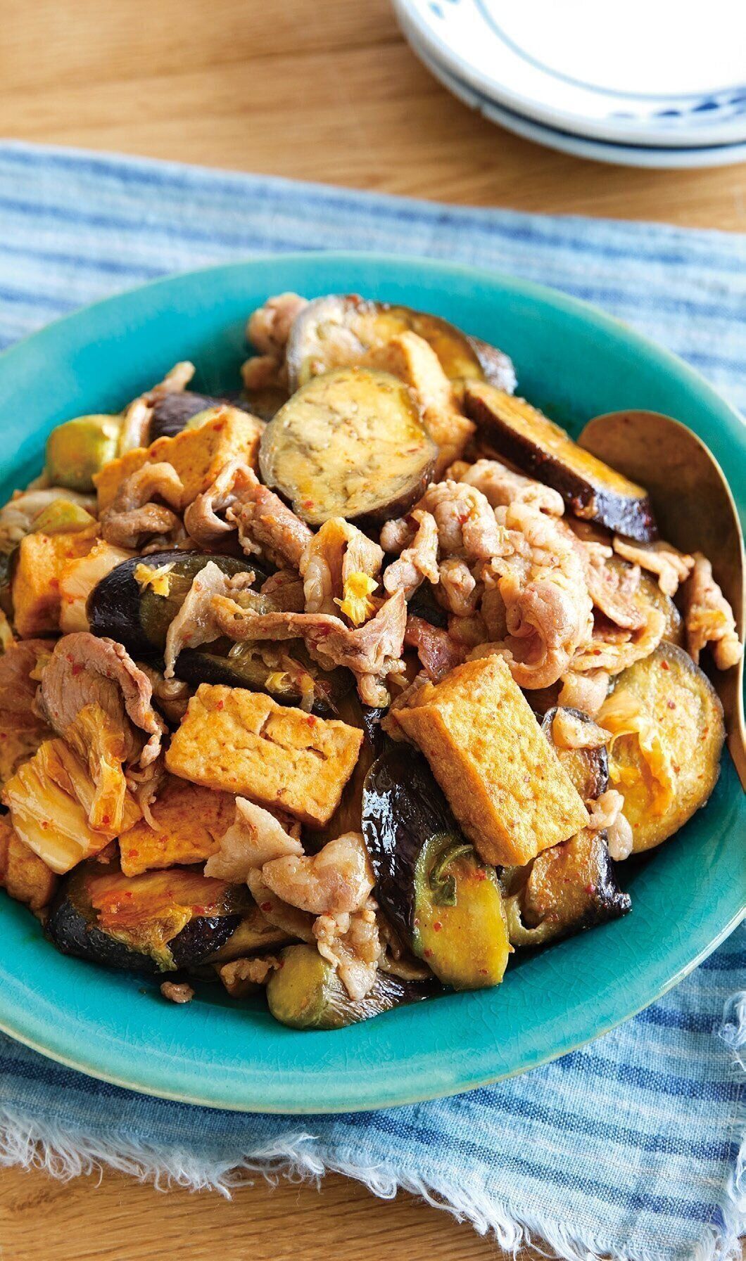 フライパンを熱し、油をなじませ、豚肉を入れ、色が変わるまでほぐしながら強めの中火で炒める。水けをきったなすと厚揚げを加え、なすがしんなりするまでさらに炒める。