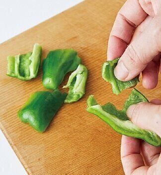 ピーマンは手でちぎればよい。ちぎったほうが調味料がなじみやすく、炒めたときにピーマン特有の香りもやわらぐ。