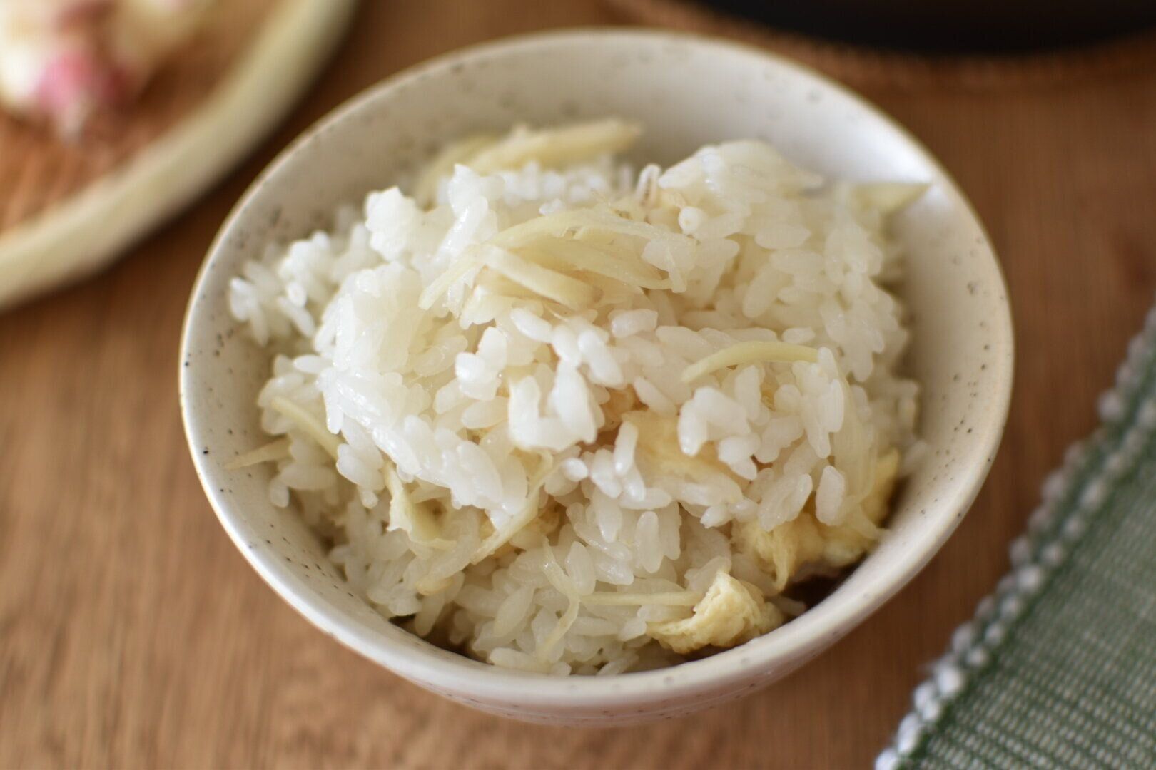 旬の新しょうがをたっぷり使い、ピリッとした辛みを楽しむことができる和風の炊き込みご飯です。