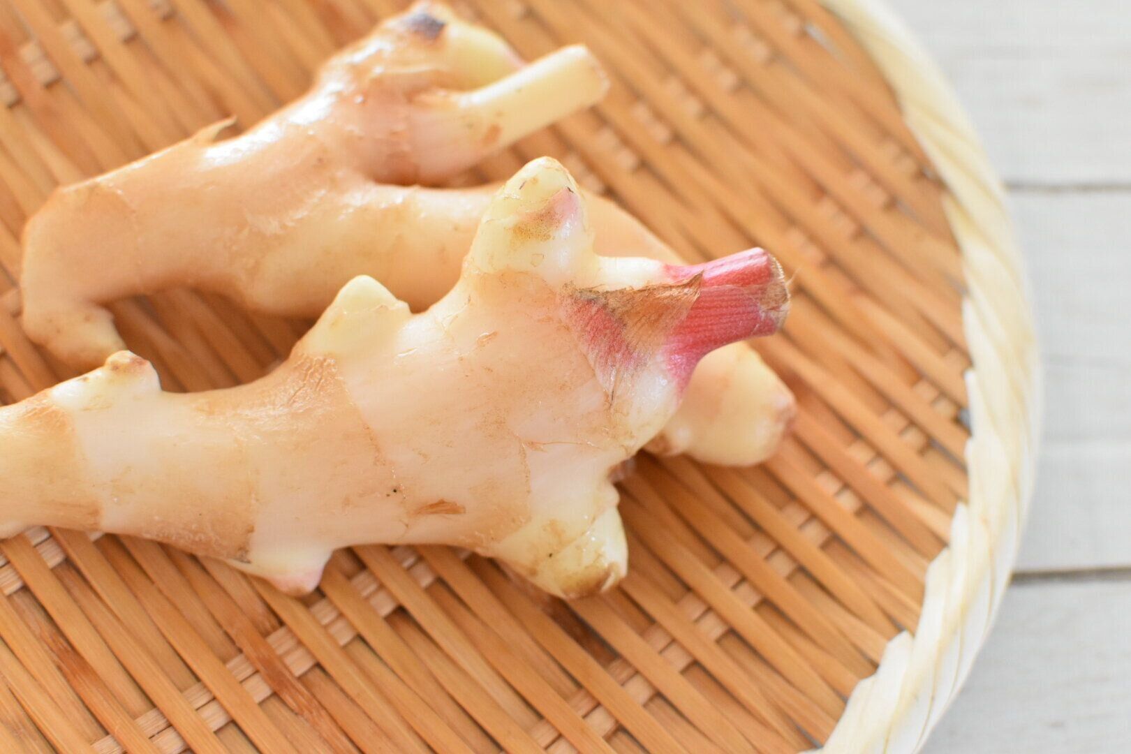 1年を通して販売されている一般的なしょうがと違い、収穫後すぐに出荷されるため色も白くて根元の部分がピンク色になっているのが特徴です。