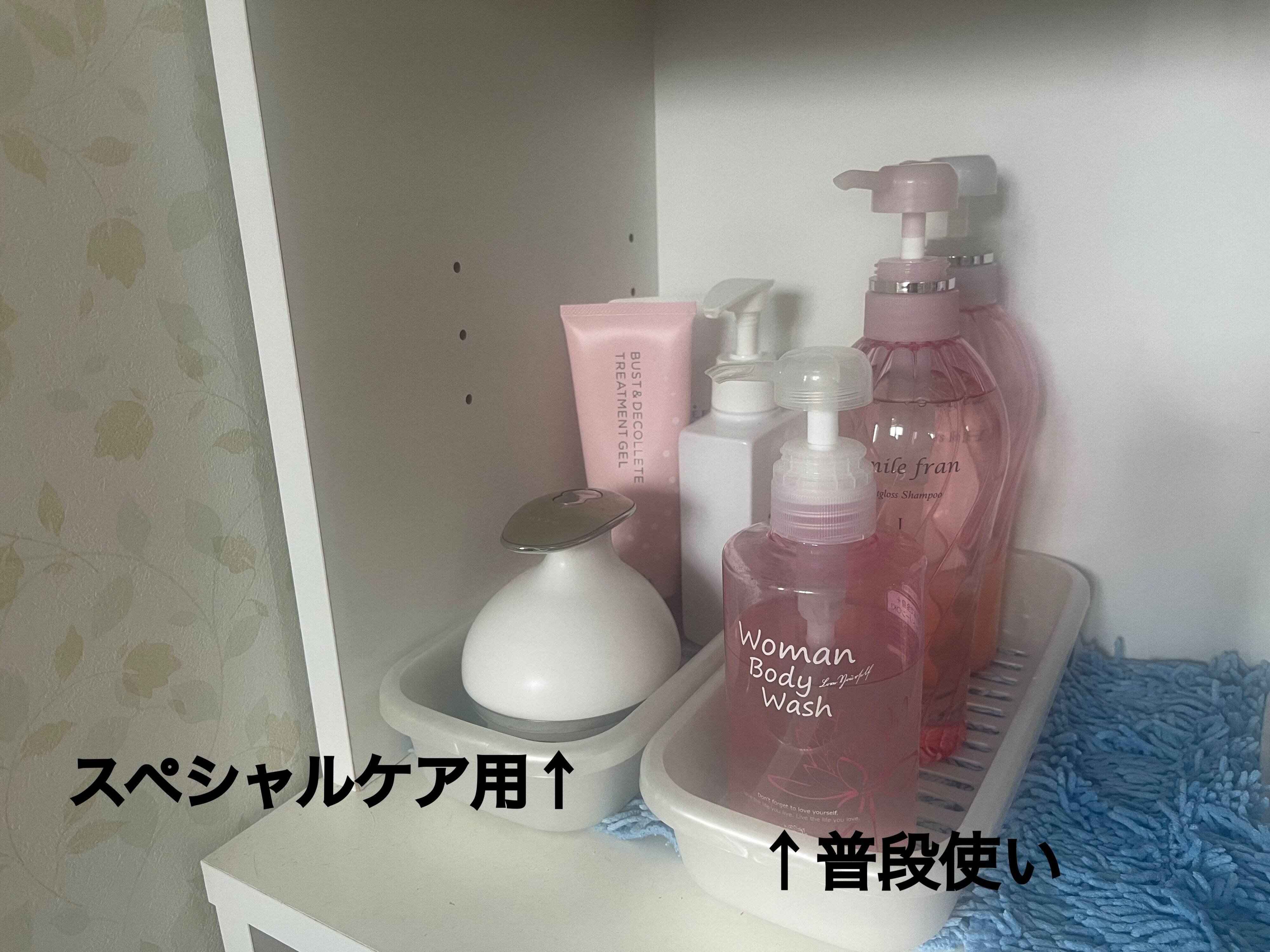 我が家は浮かせるよりも究極。お風呂上がりに持って出ます。お風呂に入る時に、必要なものを持って入る「銭湯スタイル」を続けています。脱衣所には、普段使い用とスペシャルケア用の置き場を設けています。このおかげで、お風呂上がりにワイパーをかけるのがラクなのです。