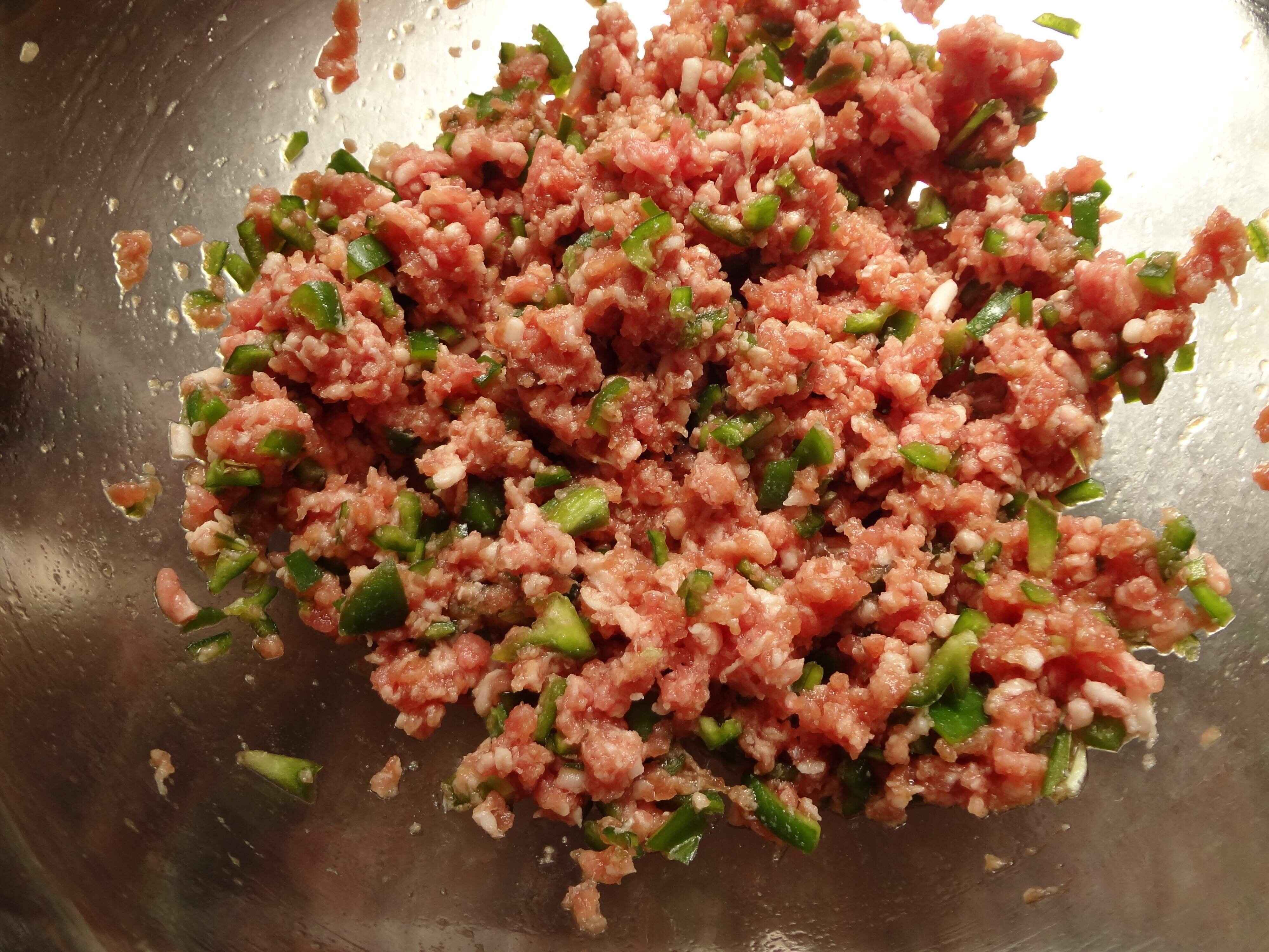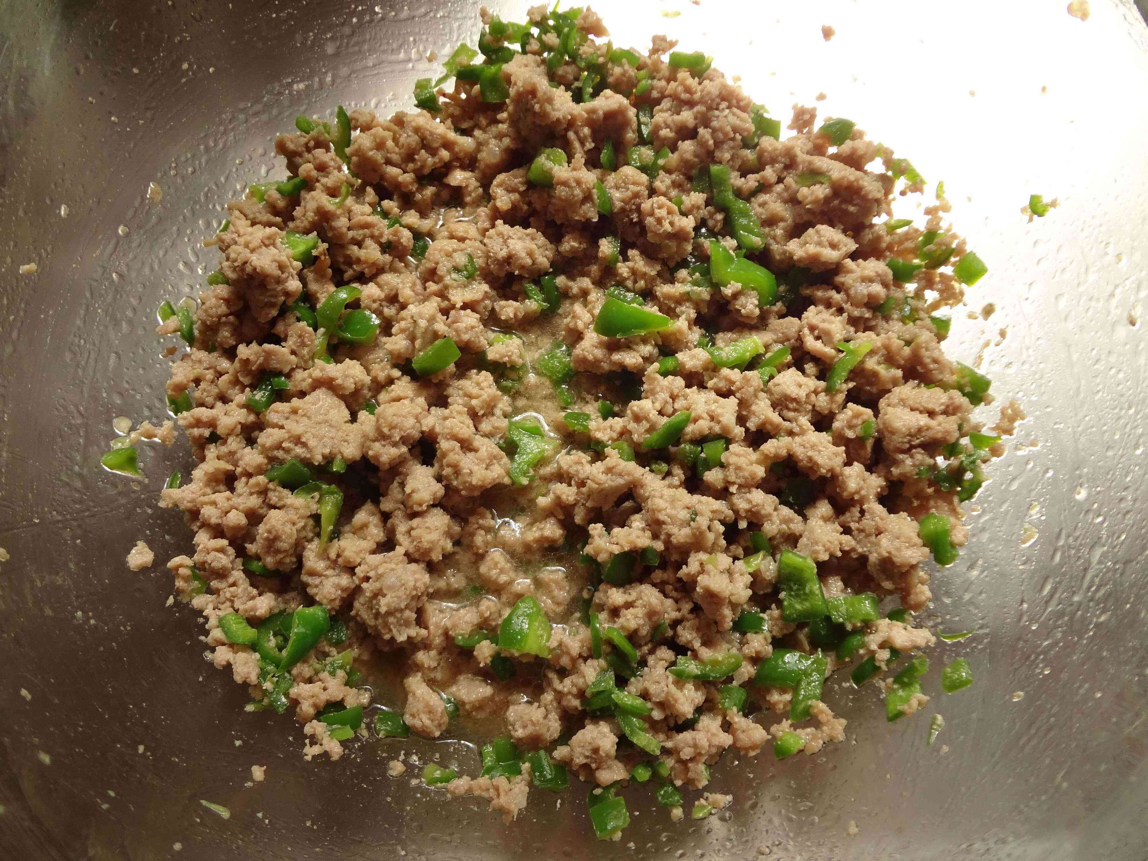 2.ピーマンとひき肉、すべての調味料を混ぜ合わせます。