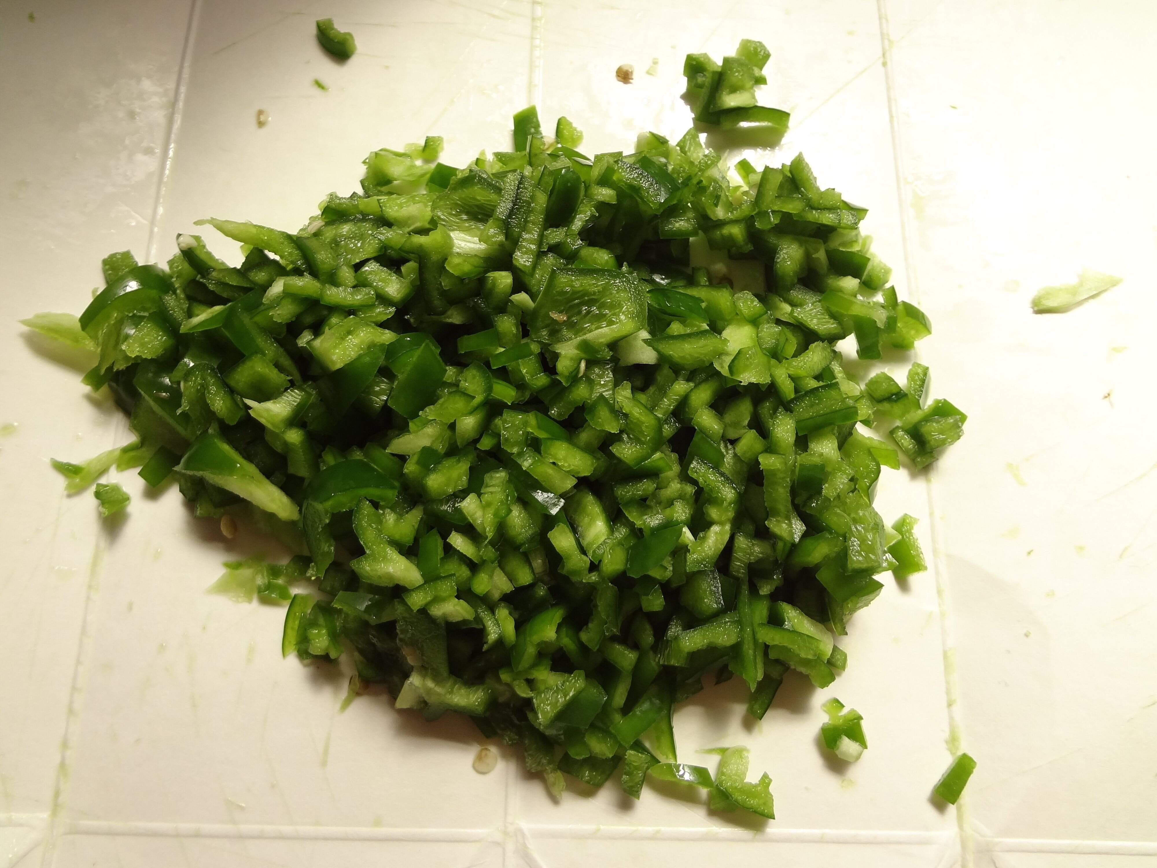 1.ピーマンはみじん切りにします。耐熱容器に入れてふんわりラップをかけ、電子レンジ600Wで1分加熱し水気を切っておきます。