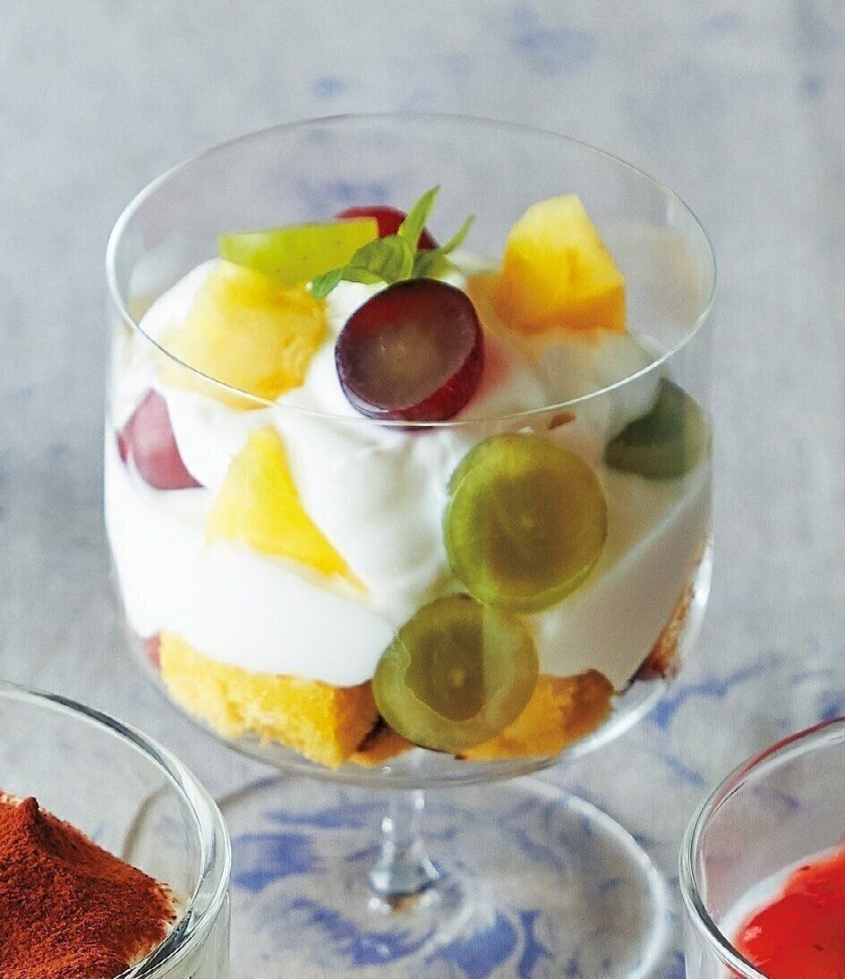 (1)水きりしたヨーグルトに砂糖を加えて混ぜ合わせる。カステラは一口大に、フルーツは食べやすい大きさに切る。