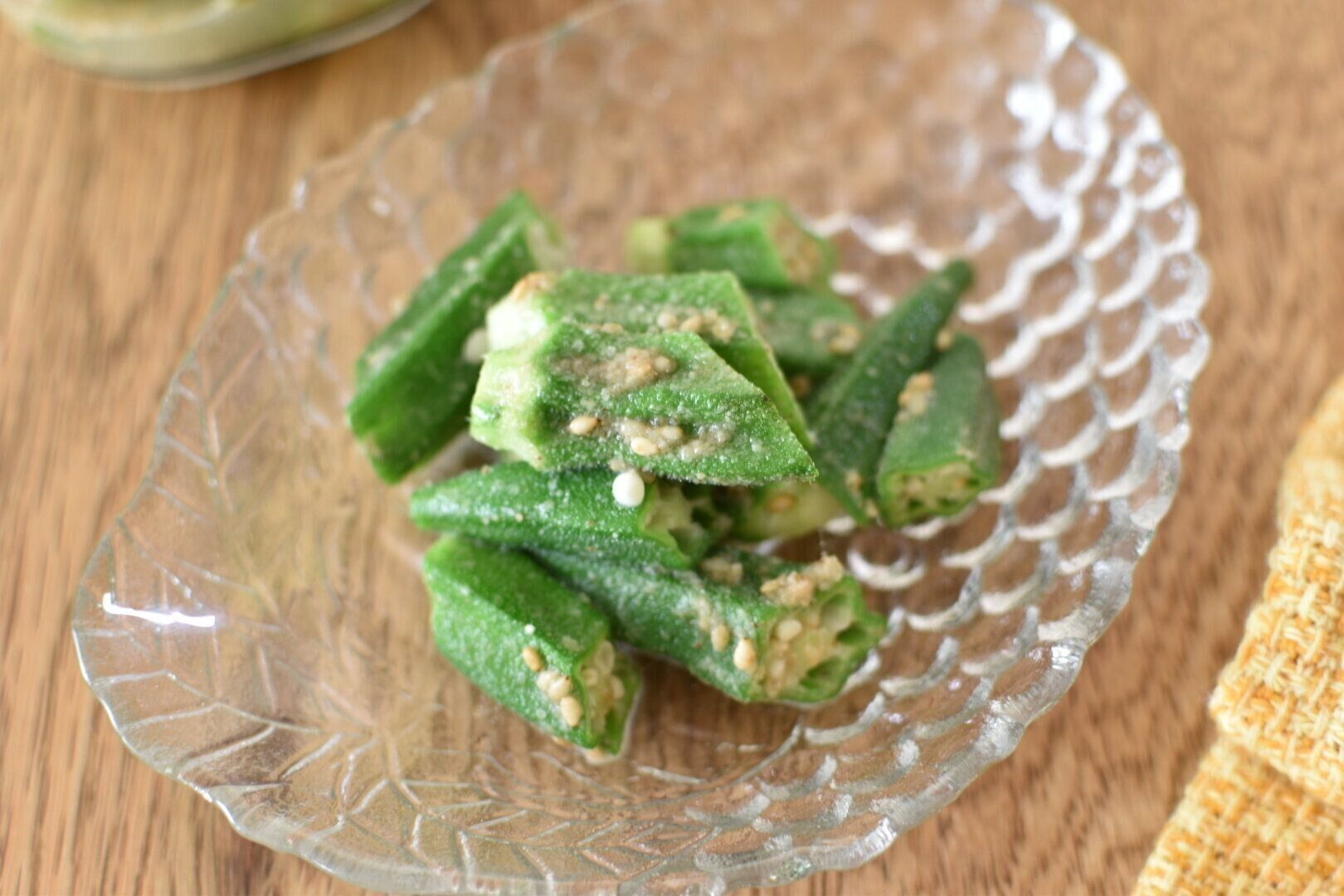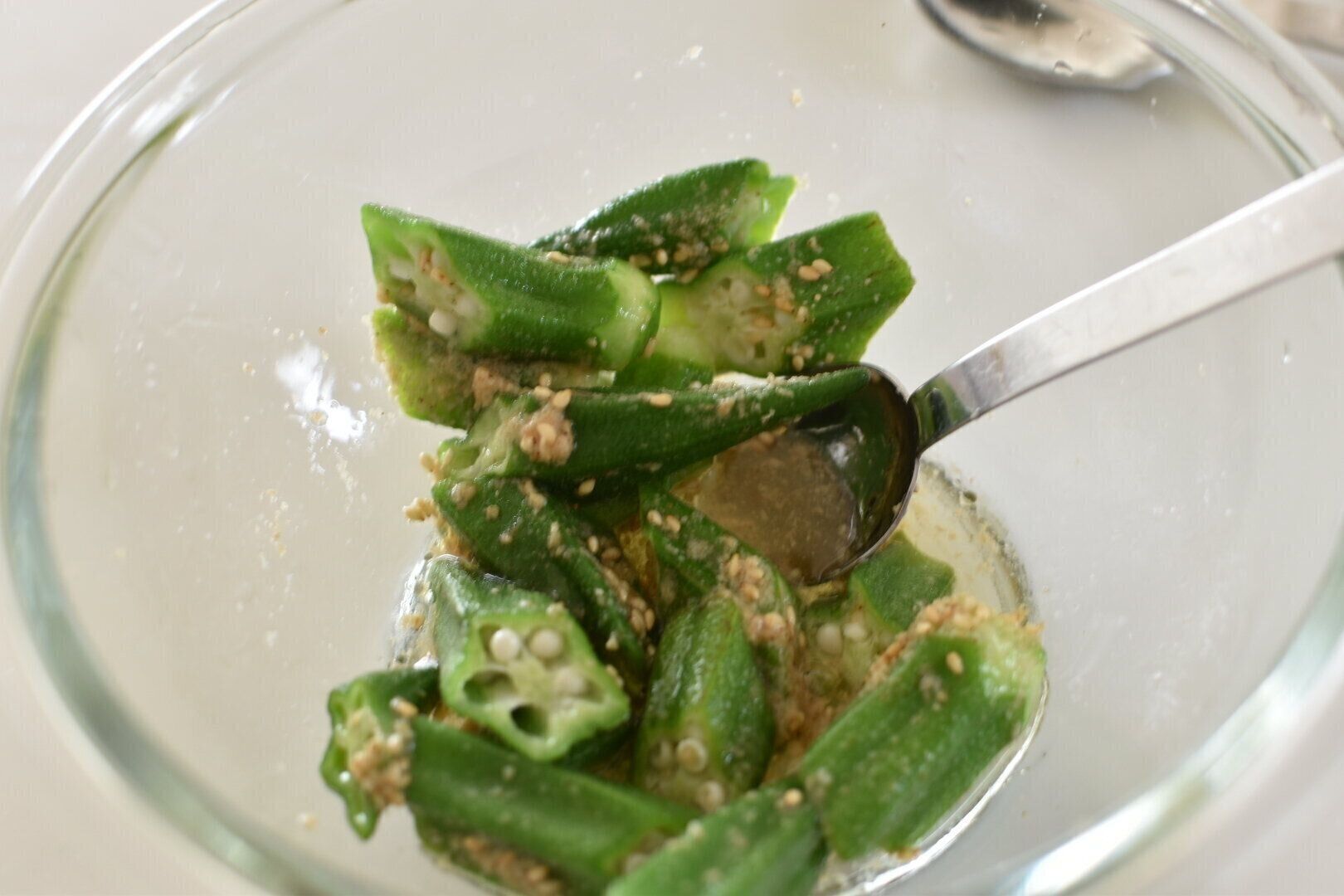 カットしたオクラを白だしとごま油に漬けるだけ!