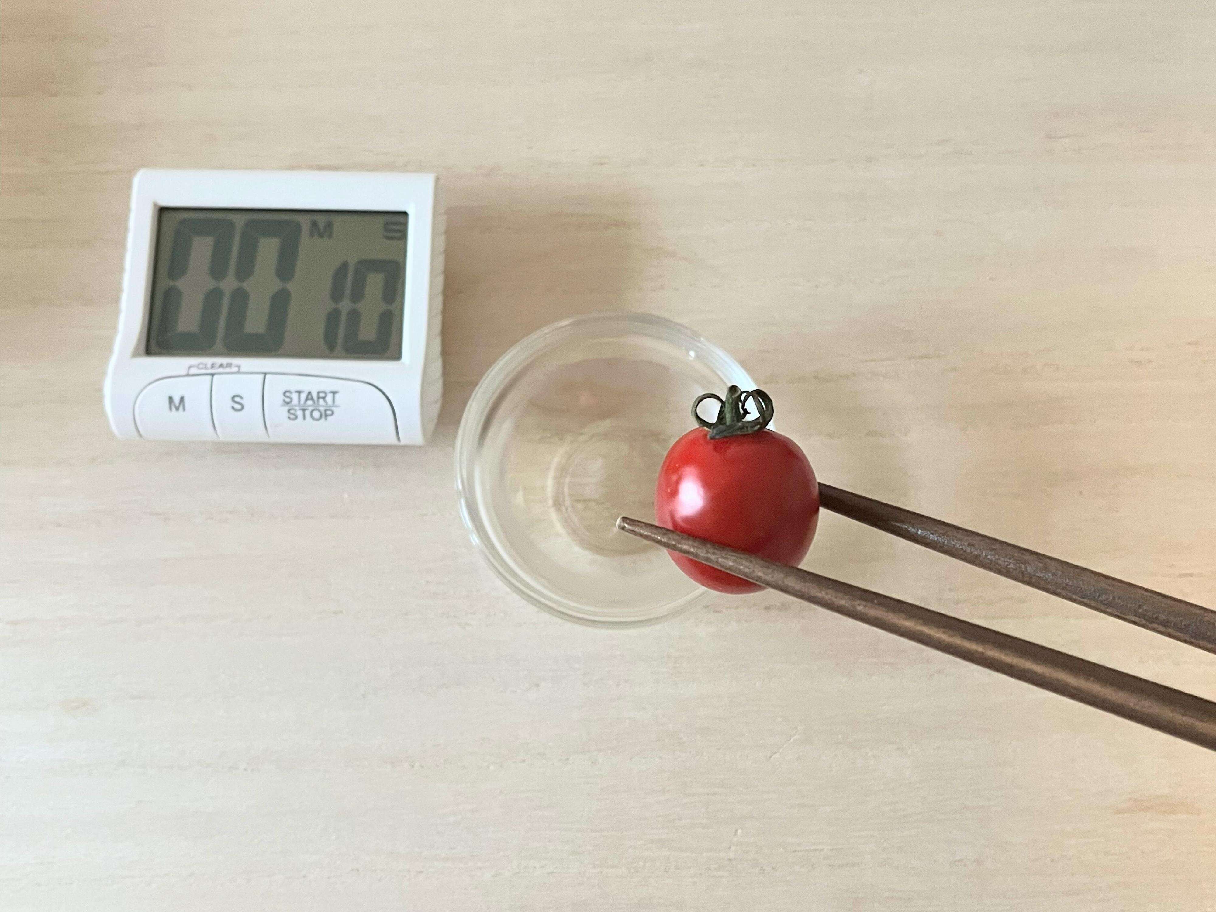 10秒後のミニトマトは、入れた直後よりハリ感が見た目から違いました。ヘタもピンと立ち、ミニトマトが元気になったようにも見えます。