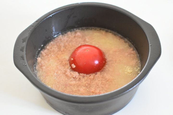 1.トマトをしっかり洗い、ヘタの部分をくり抜いたら洗米したお米の真ん中部分に埋め込む