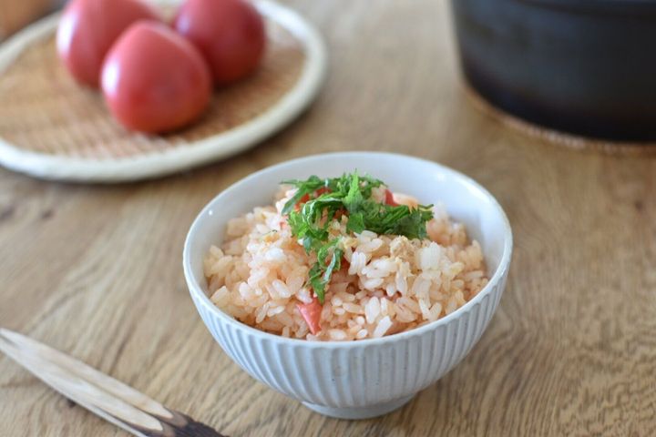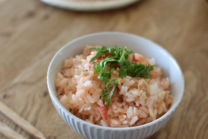 丸ごとトマトを使ったさわやかな炊き込みご飯です。